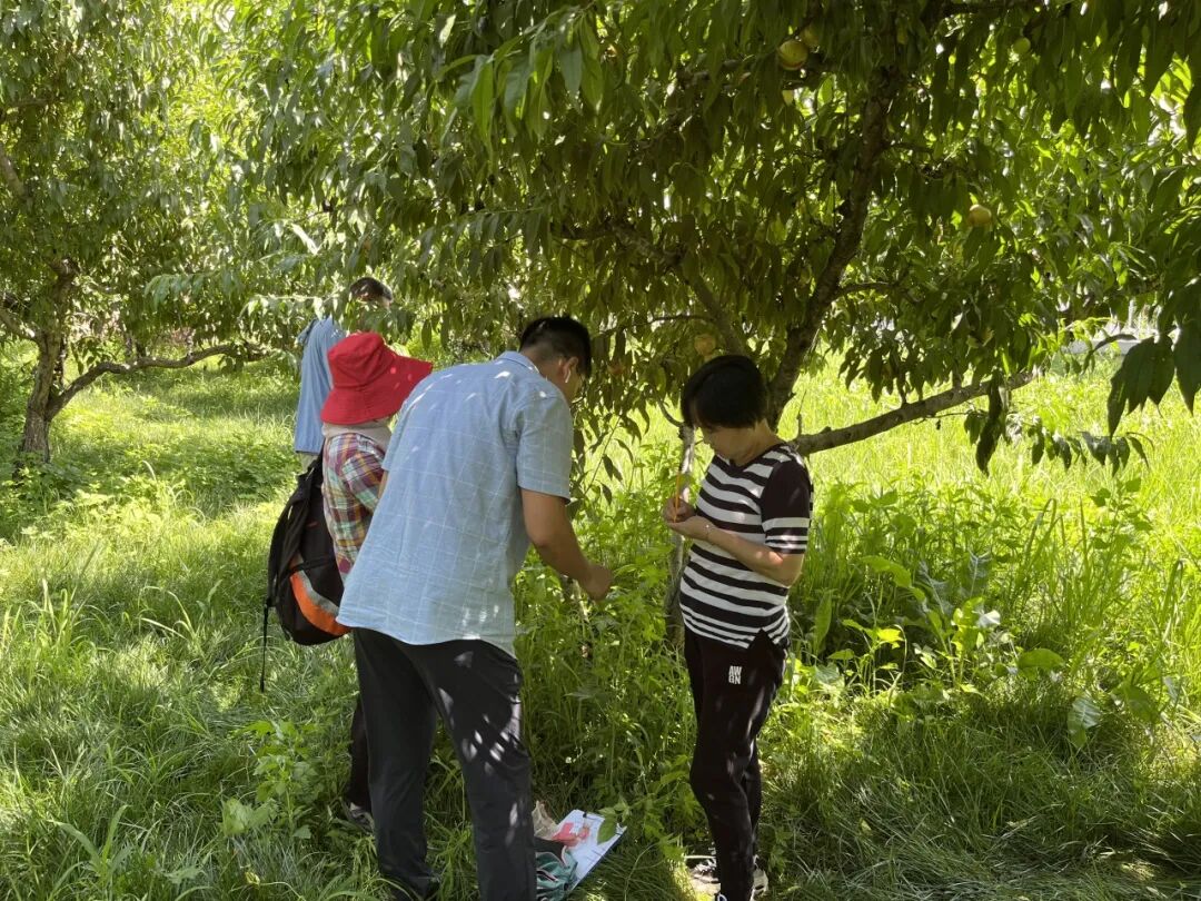 ▲在果园开展绿色生物防治桃黑斑病实验,进行相应数据测试与记录