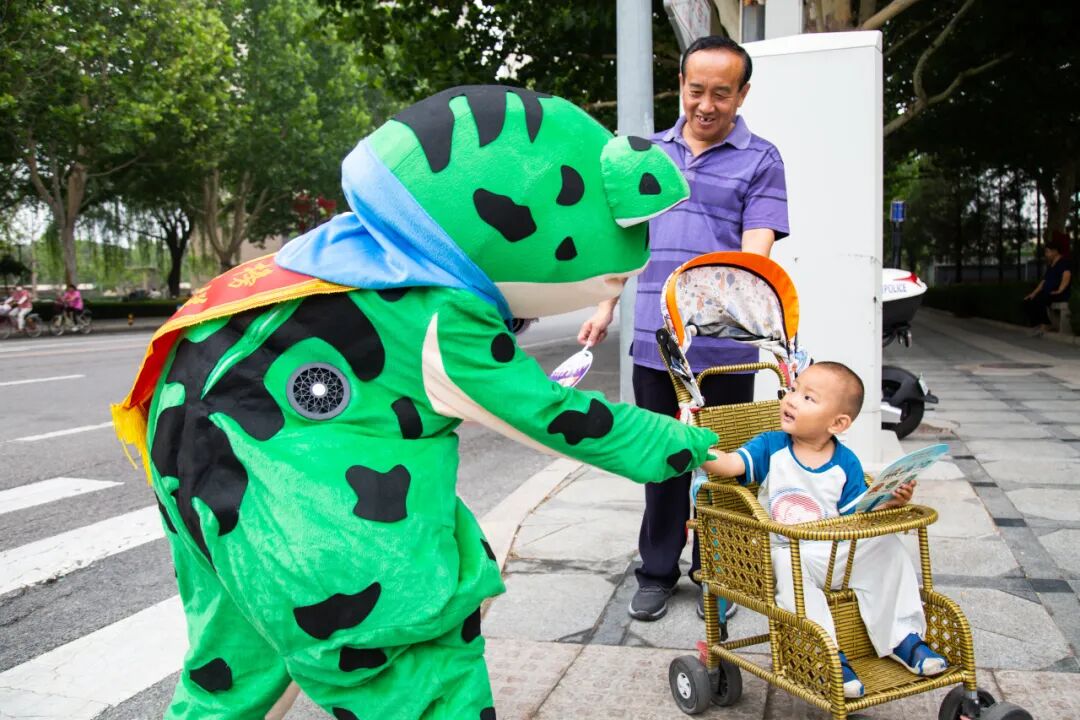 这支宣传队伍里,一支憨态可掬的“萌青蛙”十分抢眼,“萌青蛙”随着音乐扭动着笨拙的身体,引来等灯的行人纷纷侧目,逗得小朋友哈哈大笑。这是“萌青蛙”第二年参加文明交通的宣传活动了,她的主人是平谷榜样志愿服务队长王晓悦,听说要举办文明交通活动,她带着行头主动报名。