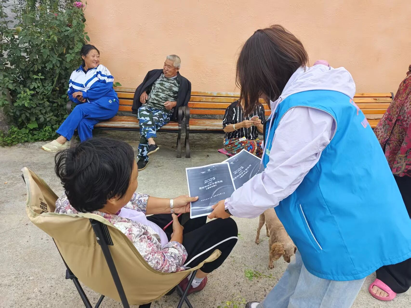 “大姐,这是网络安全宣传册,里面有防诈骗、保护个人信息的小技巧,您平时上网多留意!”