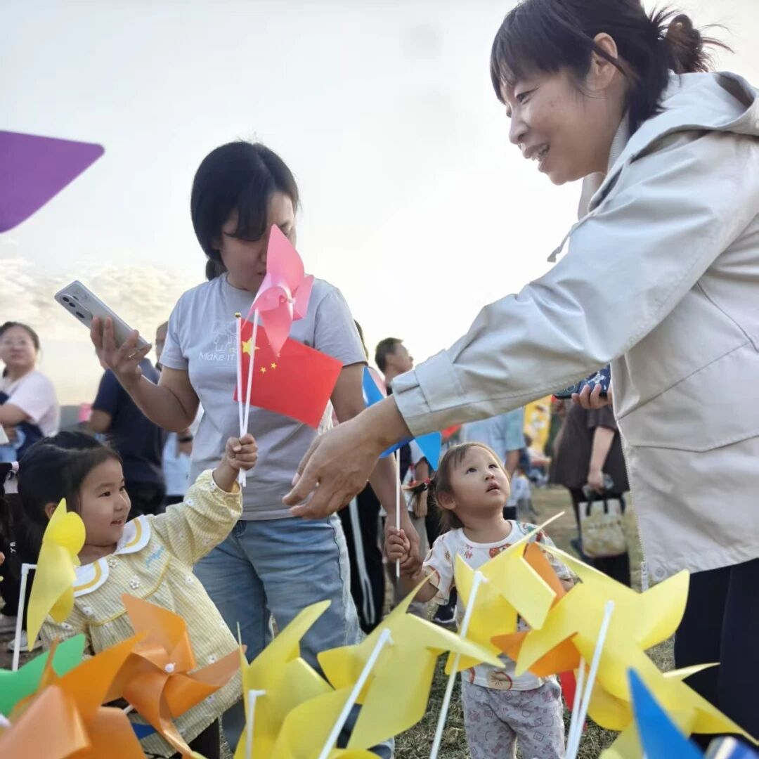 秋风拂过市集,鲜红的国旗在风中舒展飘扬,五彩风车迎着气流飞速旋转,节日的热闹与活力洒满市集。