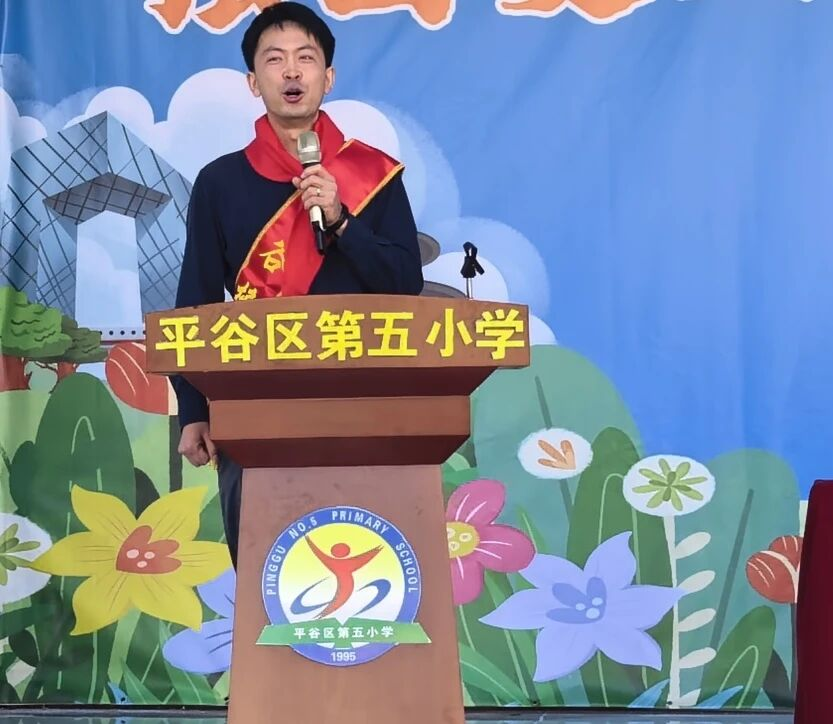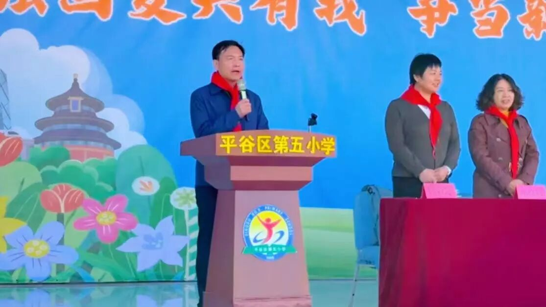 平谷区委教育工委副书记刘亚东宣布:平谷五小“追光队旗下 争做小榜样”主题实践教育活动启动。