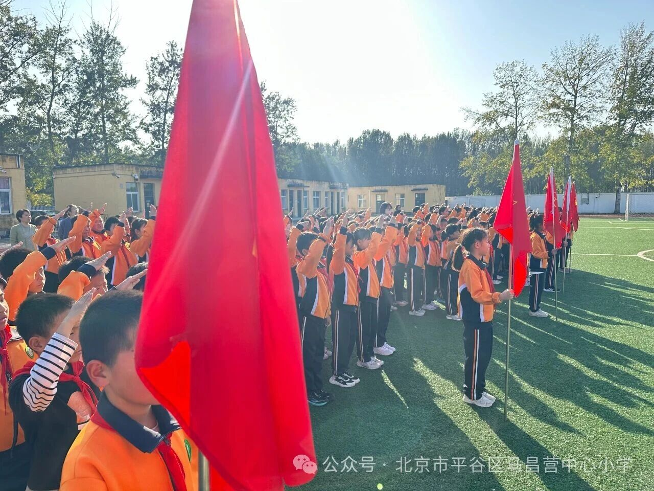 伴随着激昂的《出旗曲》,少先队旗手迈着坚定的步伐,高举队旗缓缓入场,全体队员肃立敬礼,目光紧紧追随队旗,尽显对少先队组织的崇敬与热爱,嘹亮的《中国少年先锋队队歌》传递出队员们蓬勃向上的精神风貌。