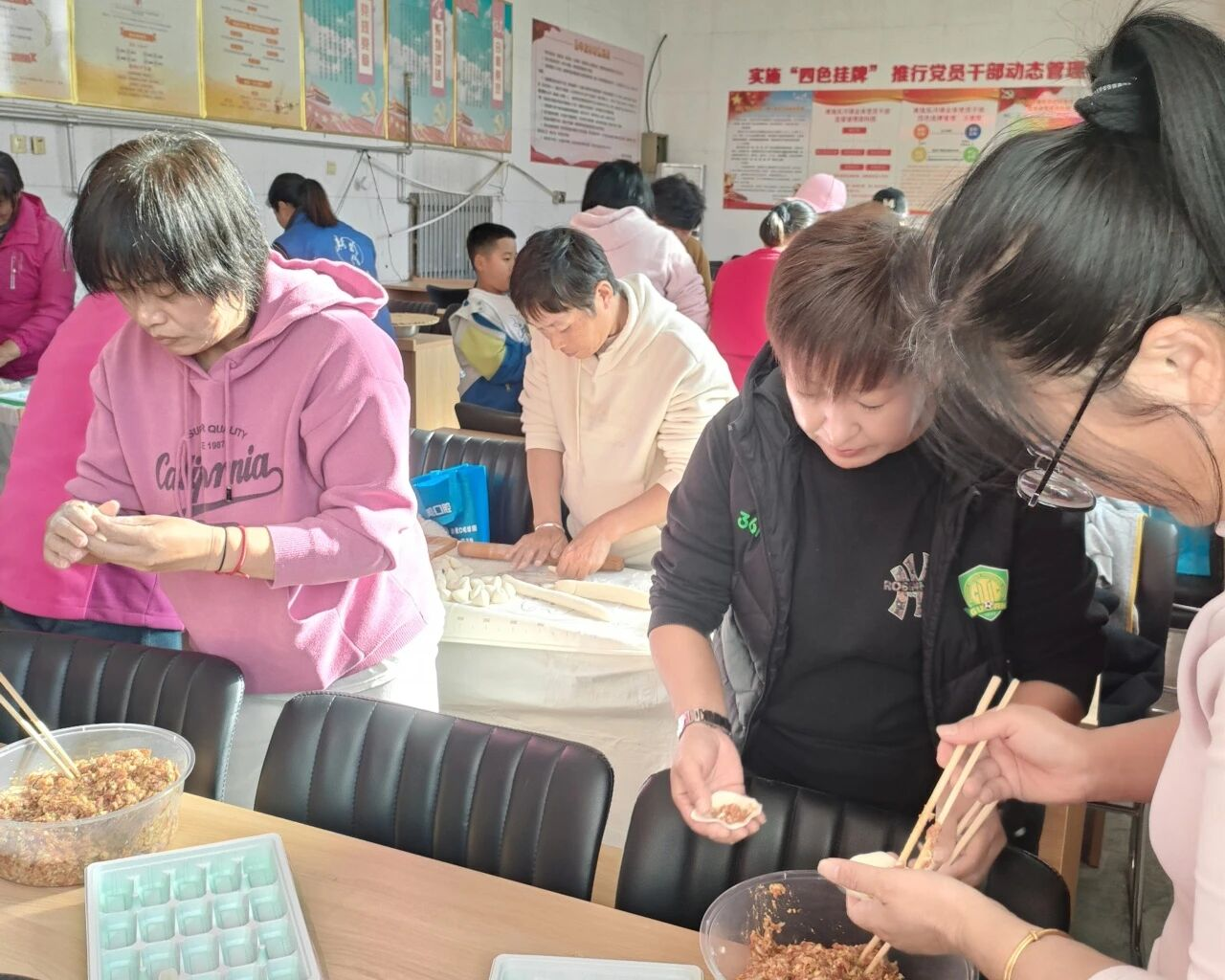 志愿者提前备好面粉、肉、白菜等新鲜食材,村民们早早来到现场,熟练地围在桌前分工协作。揉面、擀皮、调馅、包饺子,大家动作娴熟又默契,有的村民还现场分享包饺子技巧,教年轻人捏出漂亮的花边;有的和独居老人唠家常,现场一派热闹温馨的景象。