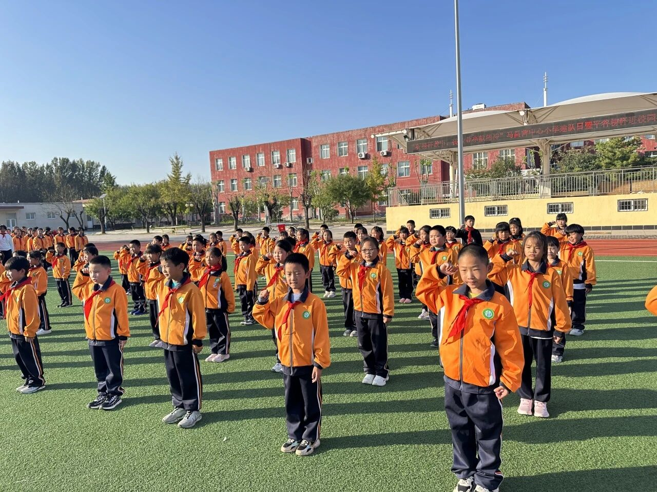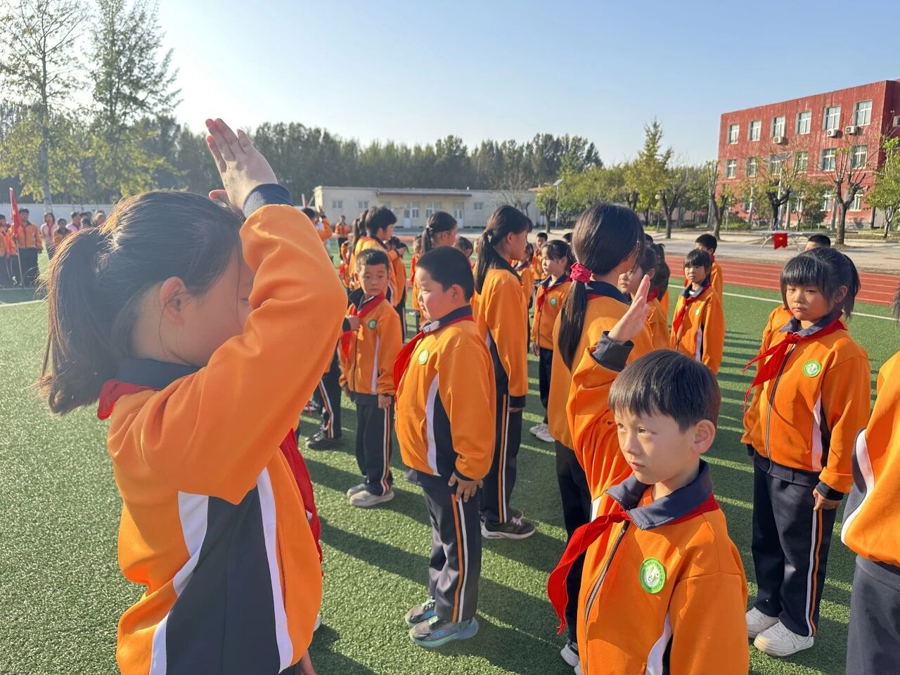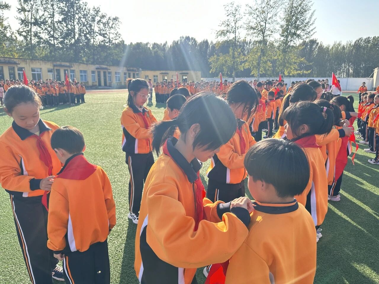 大队辅导员重宣读新队员入队决定,老队员代表手捧红领巾,为新队员佩戴整齐。在熠熠生辉的队旗下,新队员们举起右拳庄严宣誓,每一句誓言都铿锵有力,将少先队员的光荣使命与责任担当,深深镌刻在心中。