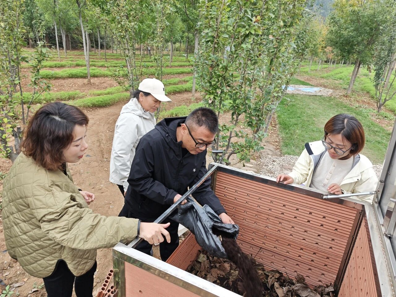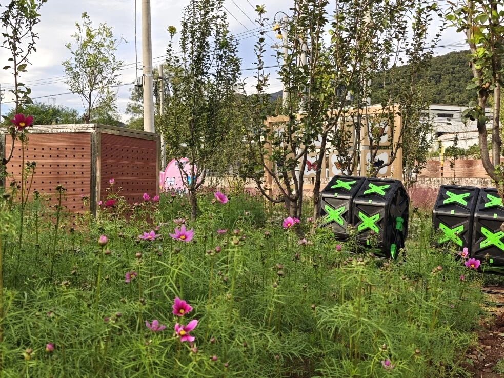 活动中,镇域内多家咖啡门店积极捐赠咖啡渣,为堆肥提供关键氮源;村民踊跃提供废弃柿子果以及枫叶、银杏叶、核桃叶等各类落叶,有效补充碳源与有机质,促进堆肥腐熟进程;“山谷菜”餐厅也主动配合,贡献餐前厨余菜叶,进一步优化堆肥营养结构。通过各类废弃物的科学配比与协同处理,实现了堆肥过程中碳氮平衡,使多种废弃资源在生态循环中实现价值转化。