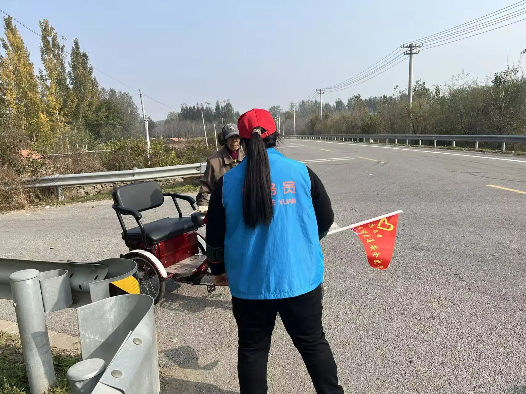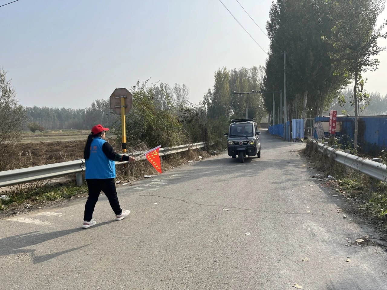 曹家庄村在全村3个重点路口,每天安排 2-3名志愿者轮流值守,设立常态化安全劝导岗,构建“定点值守 + 动态劝导”的交通安全防护网。值守中,志愿者们统一身着马甲,手持“文明交通安全出行”警示旗,对过往电动三轮车、自行车骑乘人员开展“面对面”宣传,针对闯红灯、逆行、横穿马路等违规行为及时上前劝导,用“算安全账、算经济账”的方式耐心沟通,用周边真实事故案例打消村民的侥幸心理。