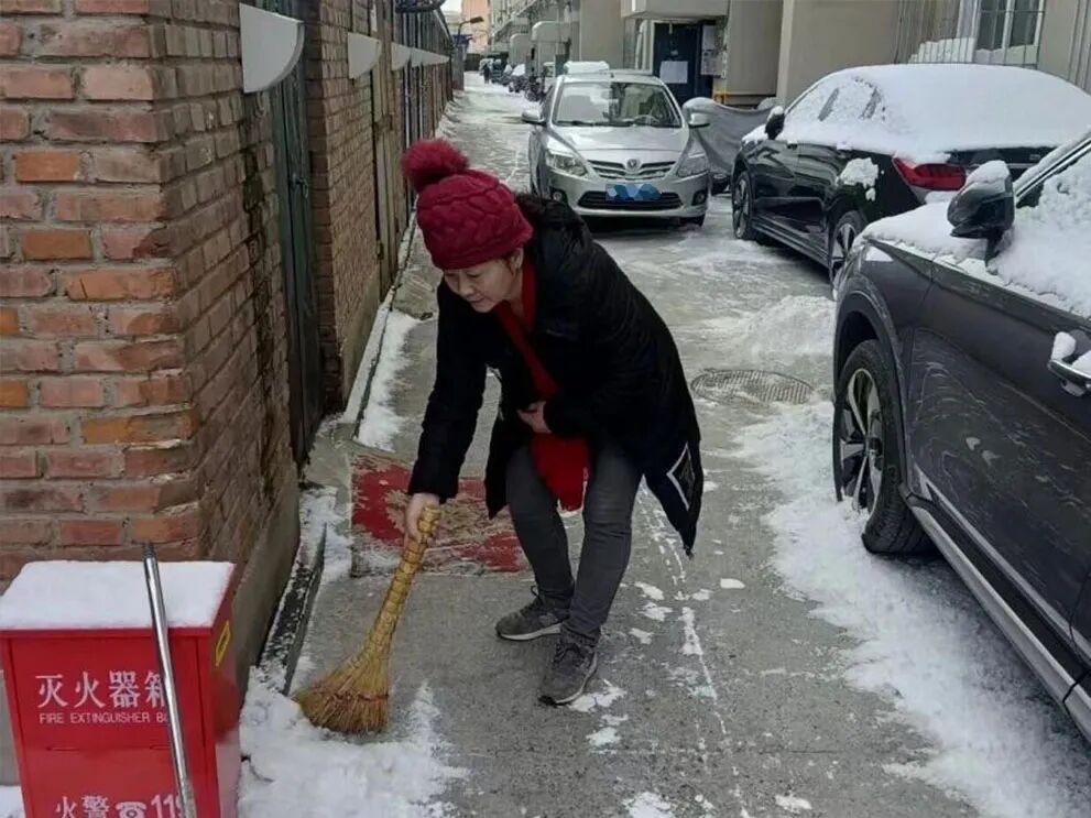 雪后初霁,社区道路上积了一层薄冰,给居民出行带来不便。天刚蒙蒙亮,尉双军就拿着扫帚和铁锹来到小区主干道,弯腰弓背地开始清扫。积雪融化后路面湿滑,她一边清扫一边提醒路过的居民“慢点走,小心路滑”,经过两个多小时的忙碌,她终于为居民清理出一条安全通道,保障了居民的出行安全。