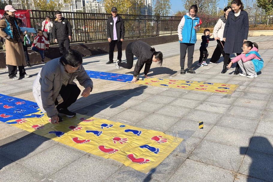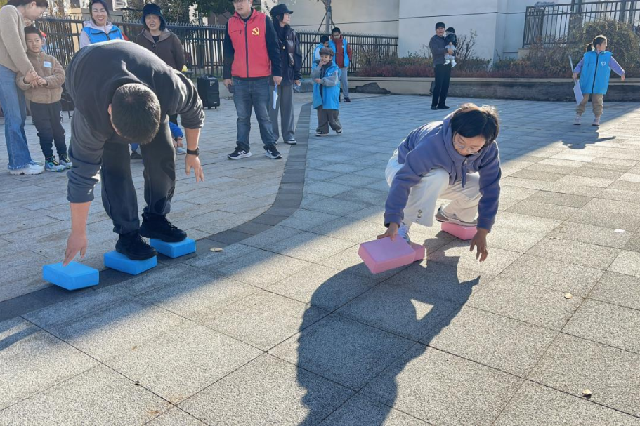 成人组 “摸石过河”项目中,选手踩着道具砖稳步前行,平衡与速度的比拼引发现场阵阵喝彩;“手脚并用” 项目最显温情,家长与孩子紧盯图示、同步动作,默契配合间拉近亲子距离。