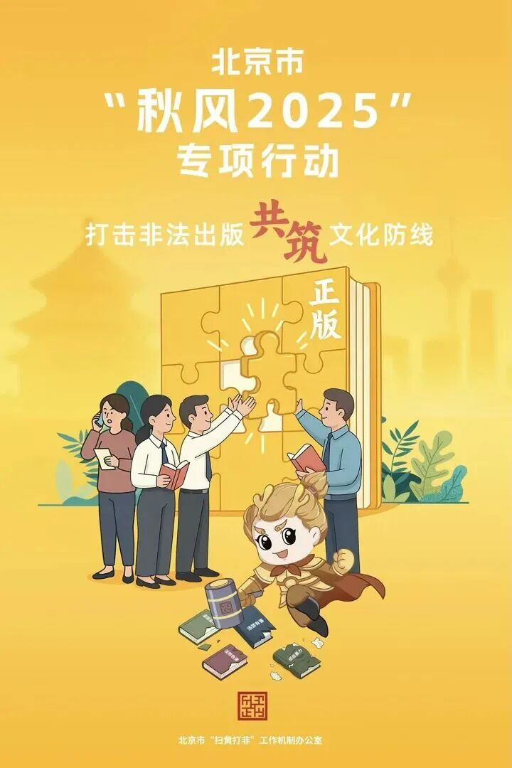 “秋风2025”专项行动海报:秋风勇士“小龙”擎“扫黄打非”正义之锤,严厉打击非法出版传播活动。行动展示“打击非法出版 共筑文化防线”决心,紧盯新闻出版领域,举报、打击、处罚、震慑非法行为,共筑文化安全防线。