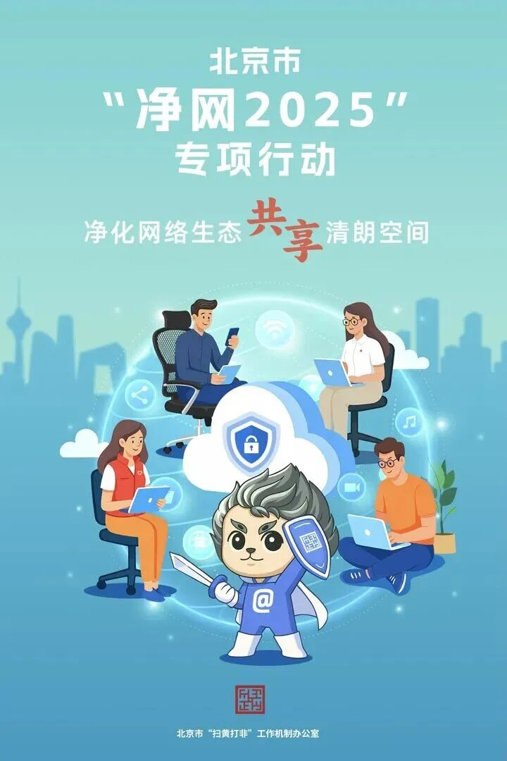 “净网2025”专项行动海报:净网先锋“小狮”执“扫黄打非”正义之剑,全面清理网络有害信息。行动突出“净化网络生态 共享清朗空间”主题,锚定互联网主战场,企业、政府、社会、网民协同治理,共享清朗网络空间。