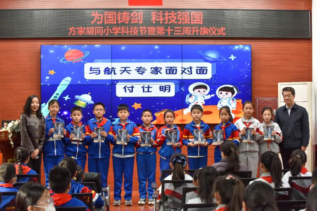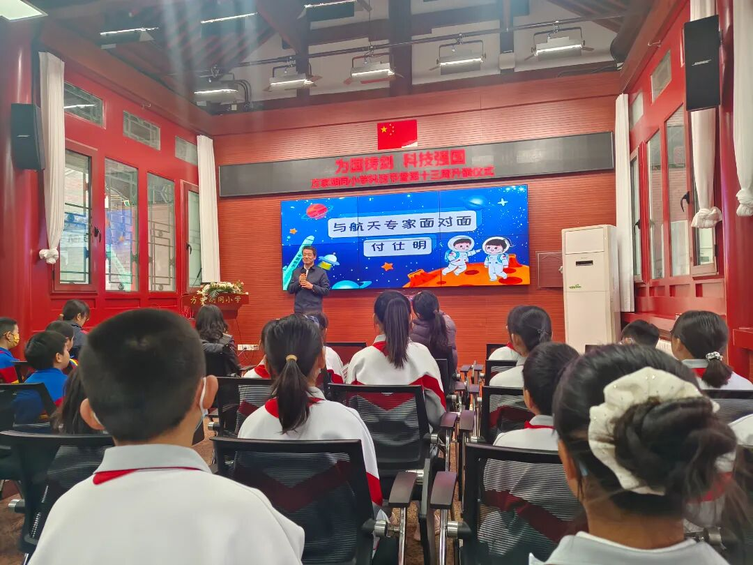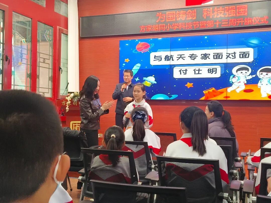 在方家胡同小学“为国铸剑,科技强国”科技节主题升旗仪式上,北京星际开发科技有限公司的创始人付士明老师为师生带来一场精彩的航天微讲座。第一次与航天大咖“面对面”交流,孩子们异常开心。付老师的精彩分享,在孩子们心中播下了探索宇宙、逐梦航天的种子。在自由提问交流中,付老师深入浅出的将复杂的航天知识耐心讲给孩子们听,同时勉励孩子们“仰望星空,脚踏实地”。