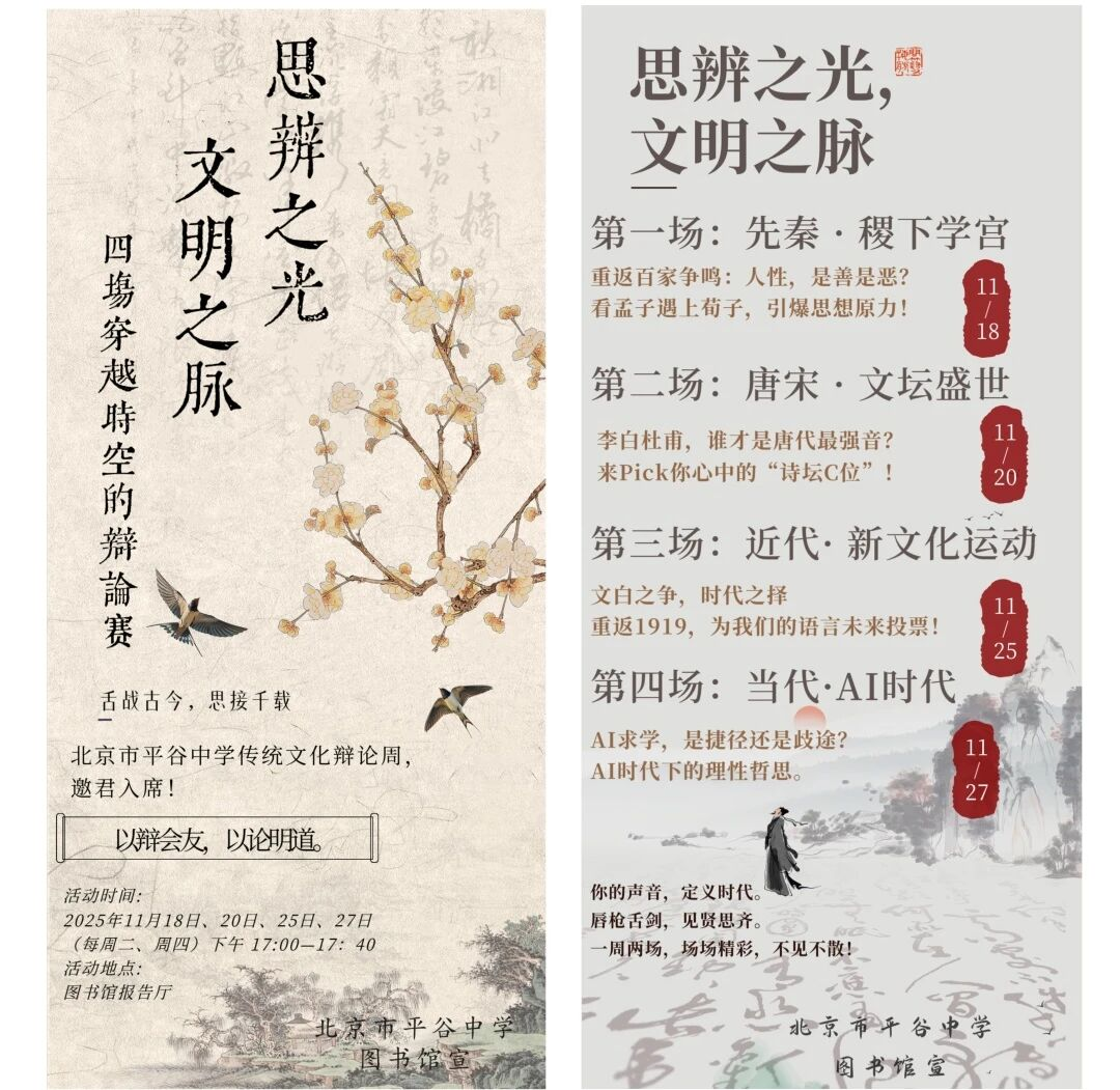 这场持续两周的思辨活动,从来不是一次简单的“辩论比赛”,而是平谷中学图书馆践行近光书院文脉传承的生动缩影。近光书院的精神内核,本就以“敬畏传统、活化文明”为核心——从先秦诸子的哲思到唐宋诗词的气韵,从近代文化变革到当代文明对话,活动设计的每一个辩题,都是对中华优秀传统文化的“现代表达”:我们不只是让学子“知道”传统文化,更让他们“参与”其中,用青春视角解读经典,让千年文明在思辨中焕发新活力。