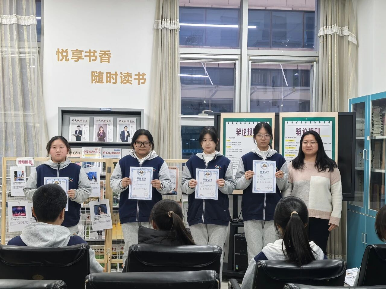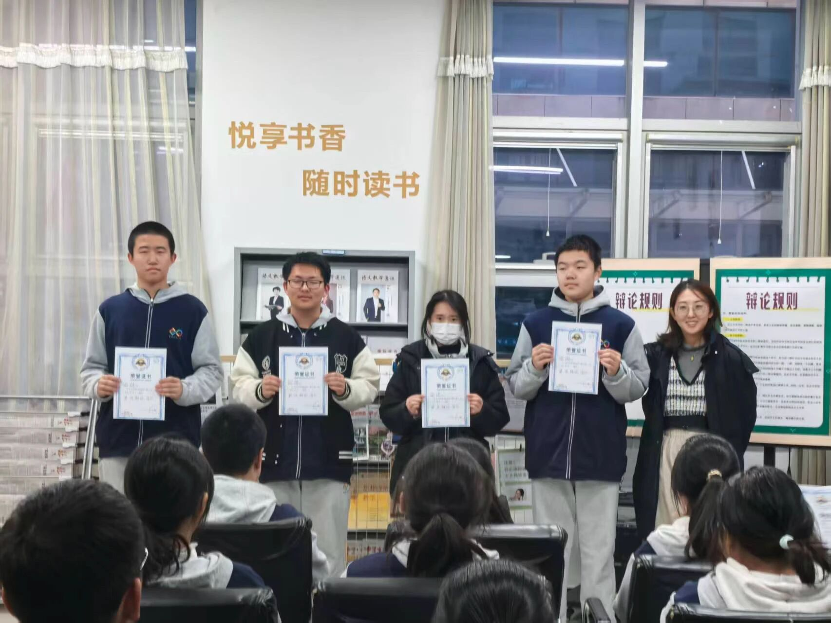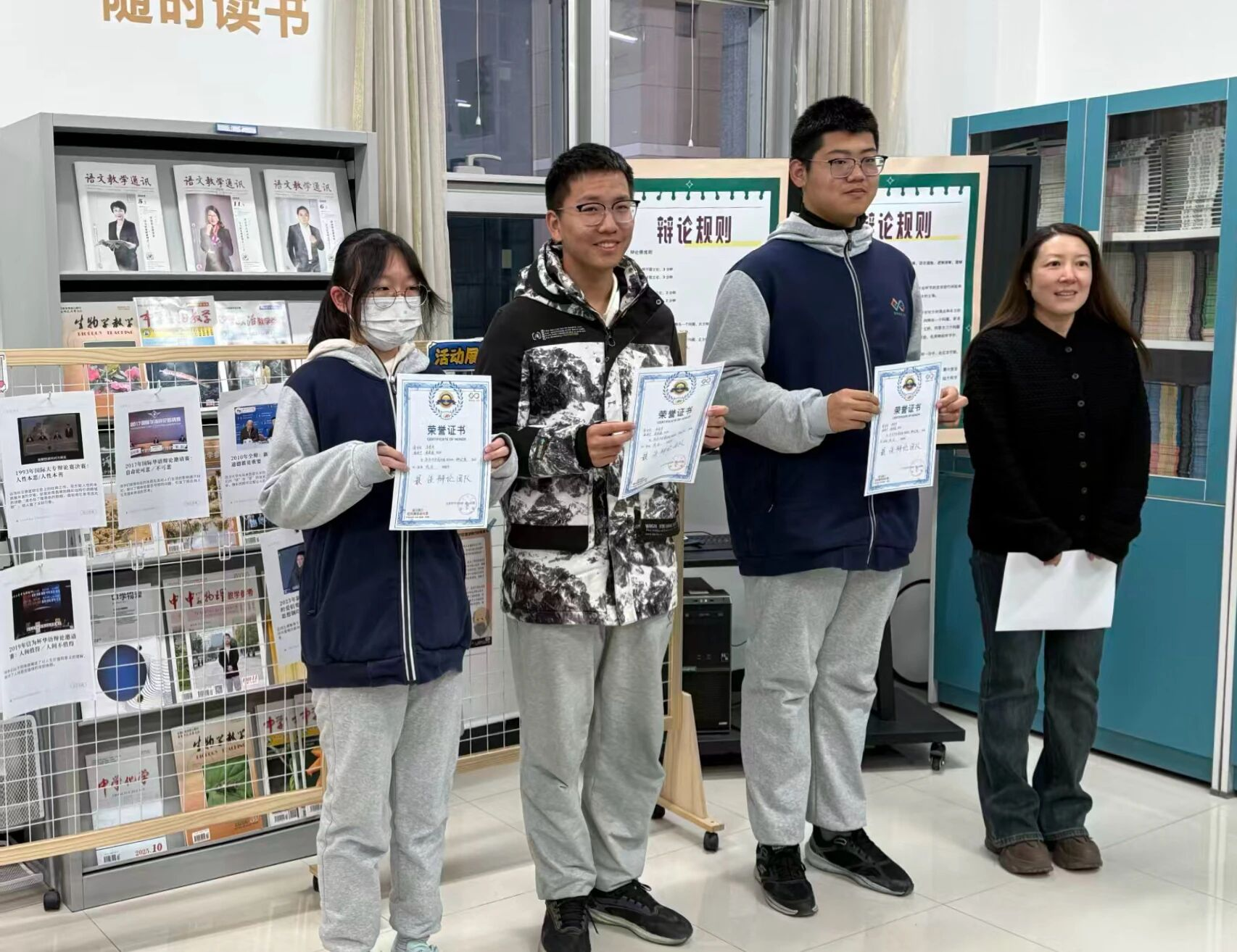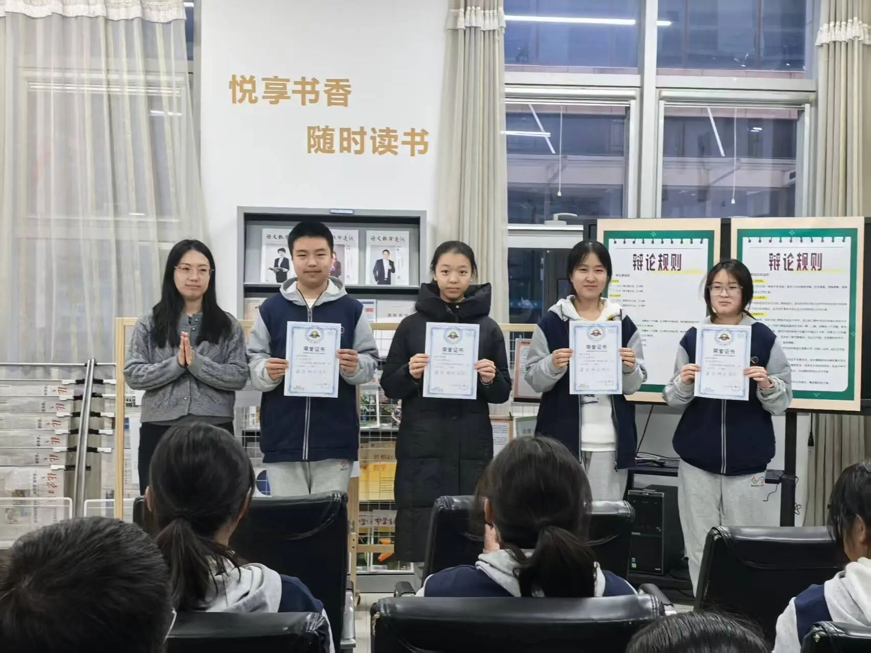 活动落幕之后,12月2日的校园里又迎来了温馨而庄重的颁奖环节:经过多轮激烈角逐与综合评定,本次文化周最终评选出4组“最佳辩论团队”与8位“最佳辩手”。高一年级李想主任与李月华副主任、图书馆贾晓奇馆长、活动宣传负责人张旭然老师来到颁奖现场,将印着荣誉的证书递到获奖者手中。当同学们双手接过荣誉,脸上洋溢着自豪的笑容,台下响起的掌声与欢乐呼声交织成一片——这份荣誉,不仅是对他们辩论技巧、协作能力的肯定,更是对他们深入思考、传承文明的鼓励。