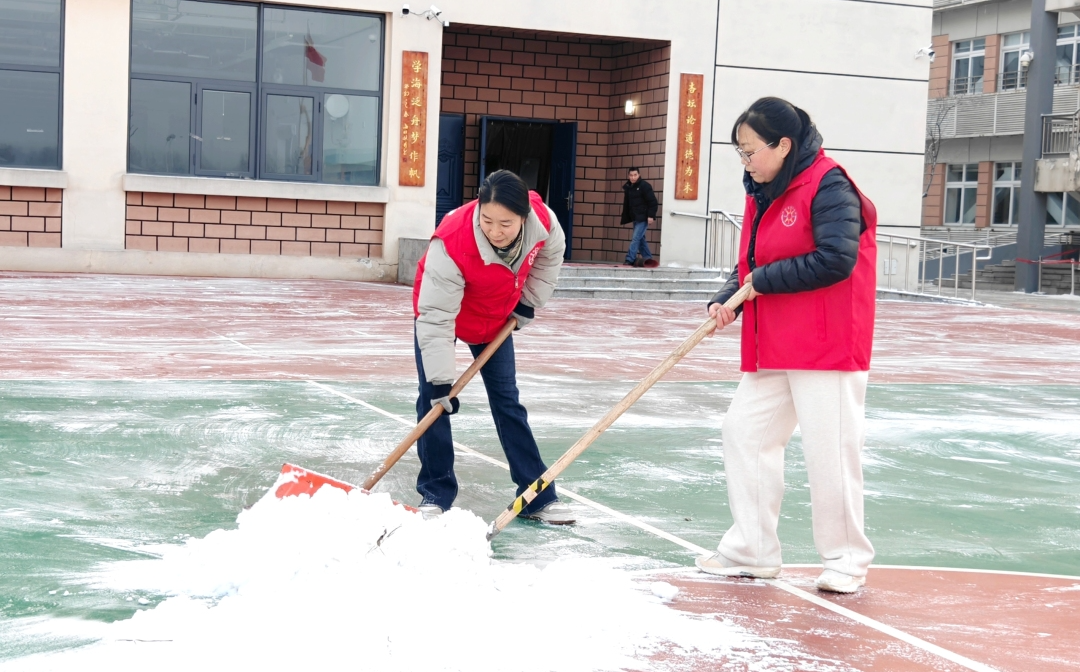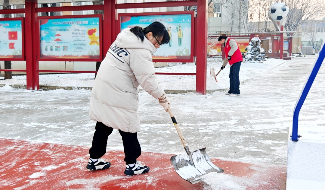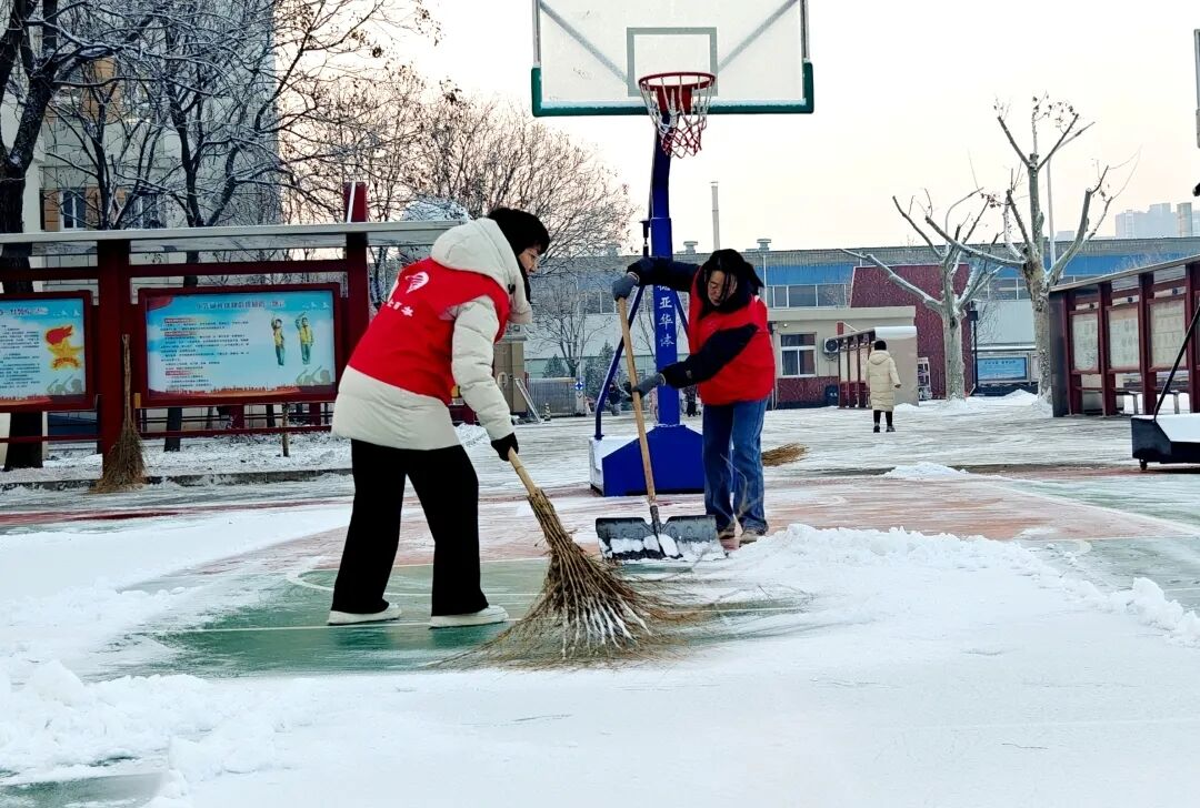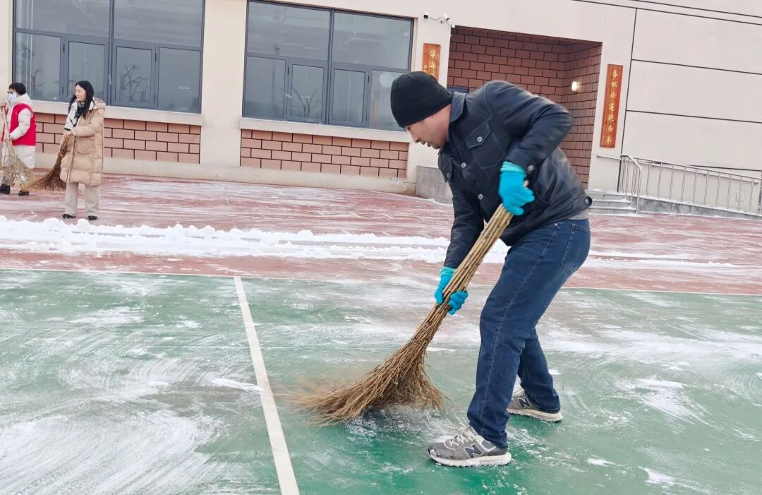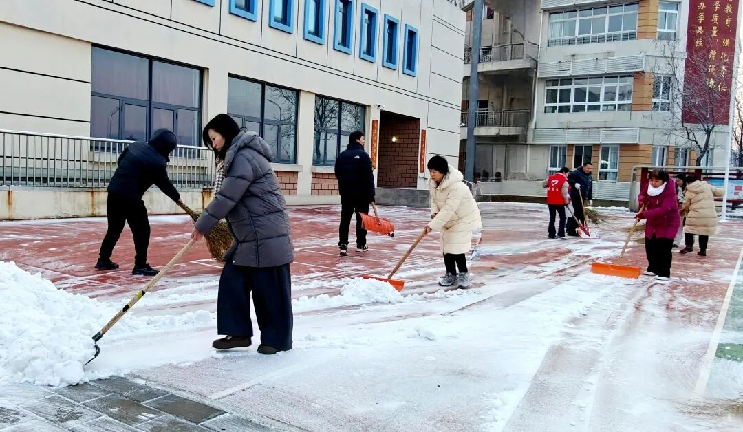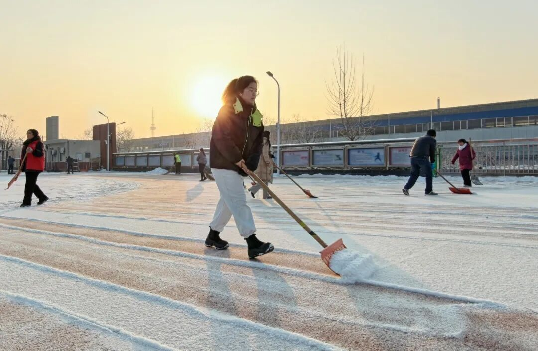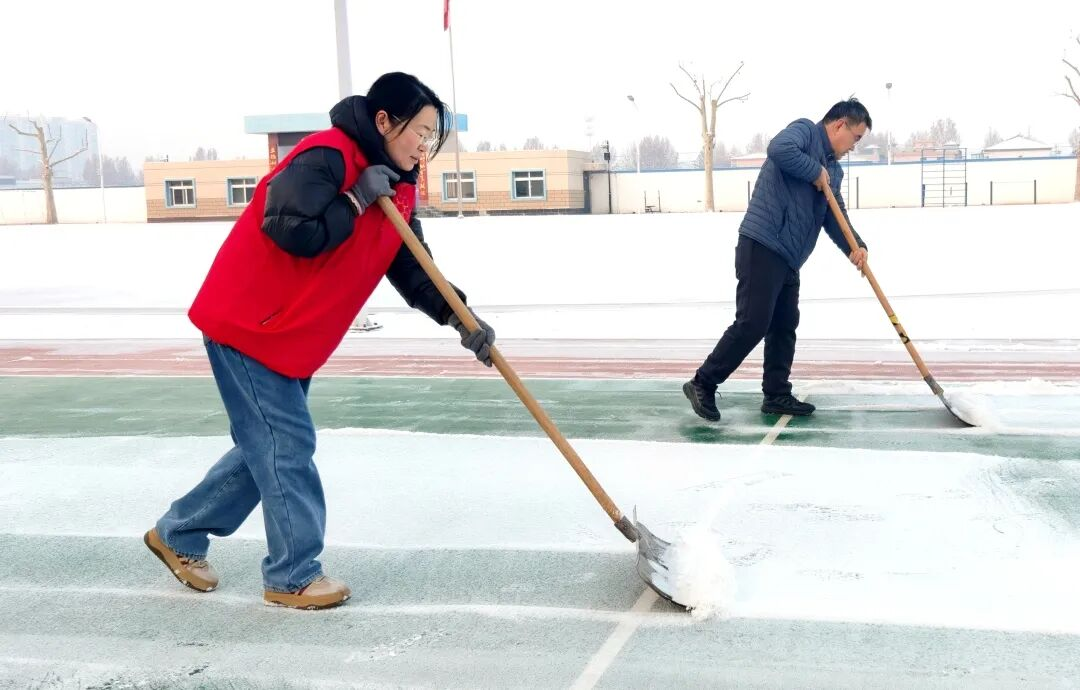 大家手持雪铲、扫帚,分工明确、默契配合,重点对校园甬路、操场跑道、篮球场等公共区域的积雪进行全面清扫。寒风中,老师们不畏严寒、干劲十足,挥舞工具的身影忙碌而坚定,热火朝天的劳动氛围驱散了冬日的寒冷。经过一个半小时的奋战,所有公共区域积雪被清扫干净,校园恢复了整洁有序的模样。