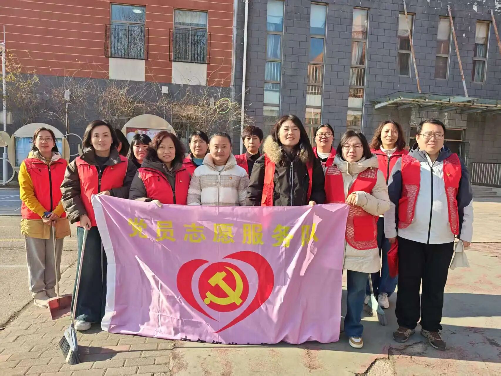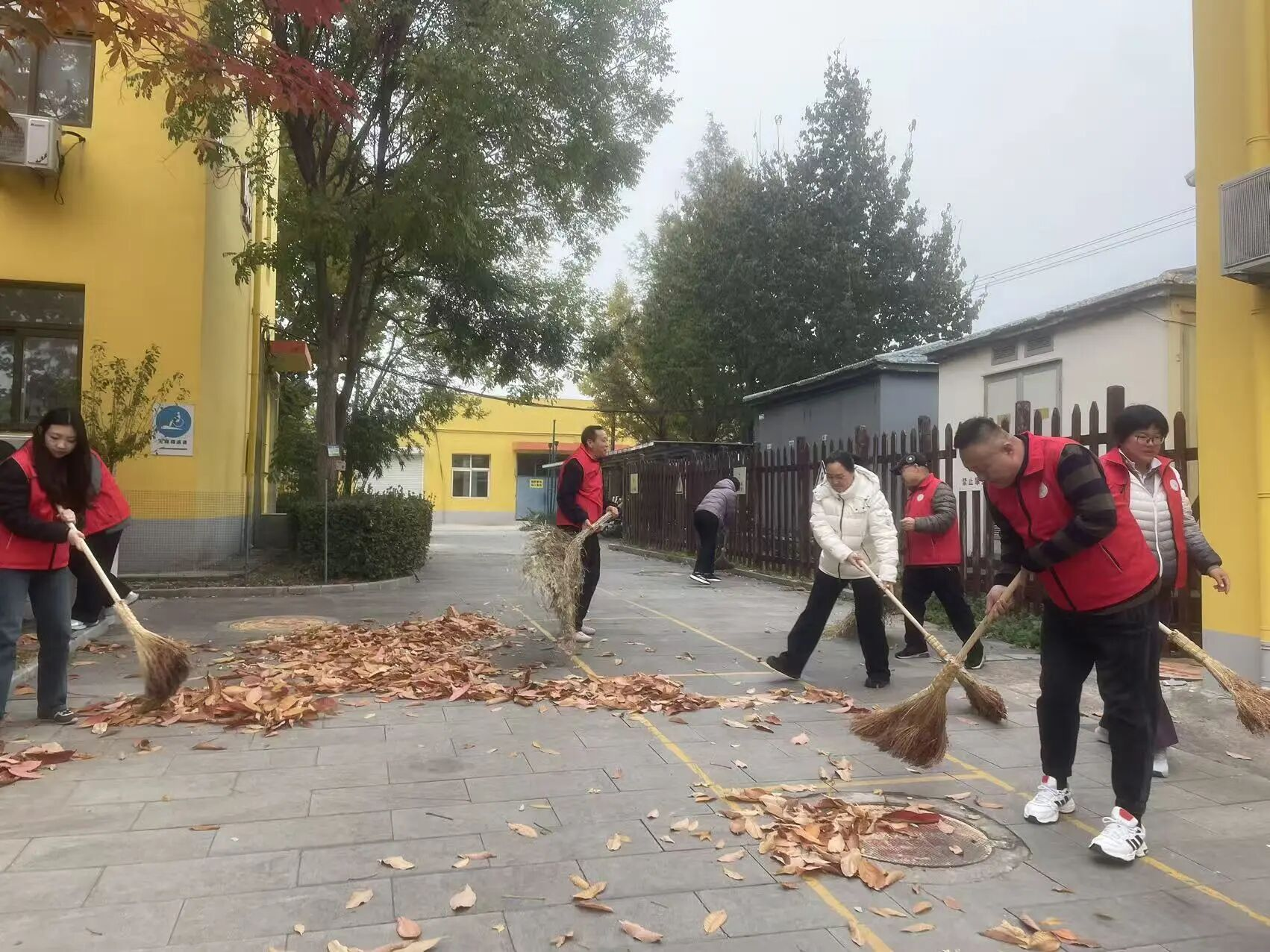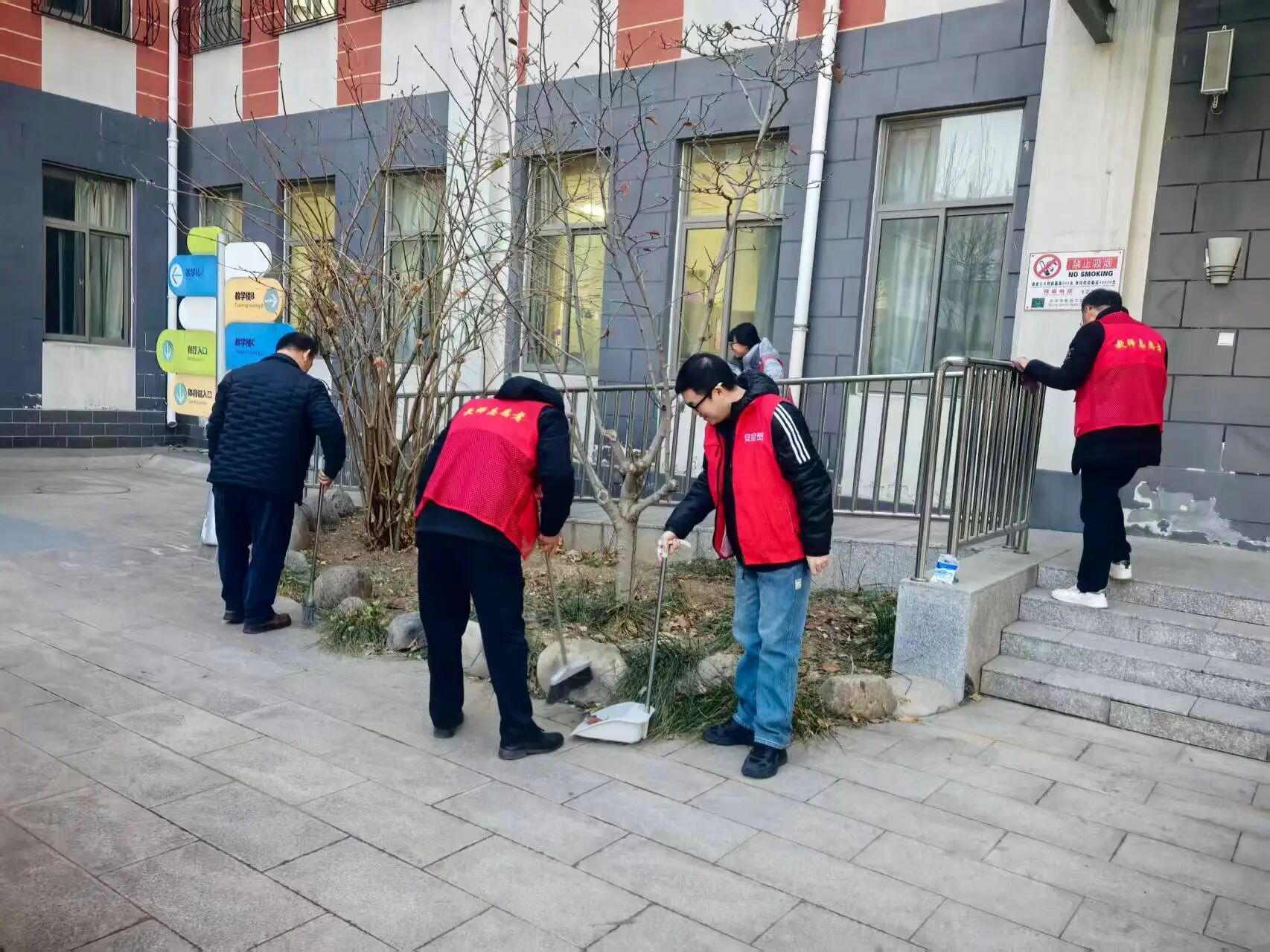 活动当天,党员志愿者们准时集合。他们佩戴党员徽章,亮明身份,手持扫帚、垃圾袋、抹布等工具,奔赴各自责任区。大家热情高涨,分工协作:有人仔细清扫路面和绿化带中的落叶杂物;有人将零散的枯枝落叶归拢成堆;有人专注清理卫生死角,并对树木进行安全检查与简单处理。尽管天气寒冷,但无人叫苦喊累。大家俯身弯腰,用实际行动践行服务宗旨,为改善校园环境贡献力量。