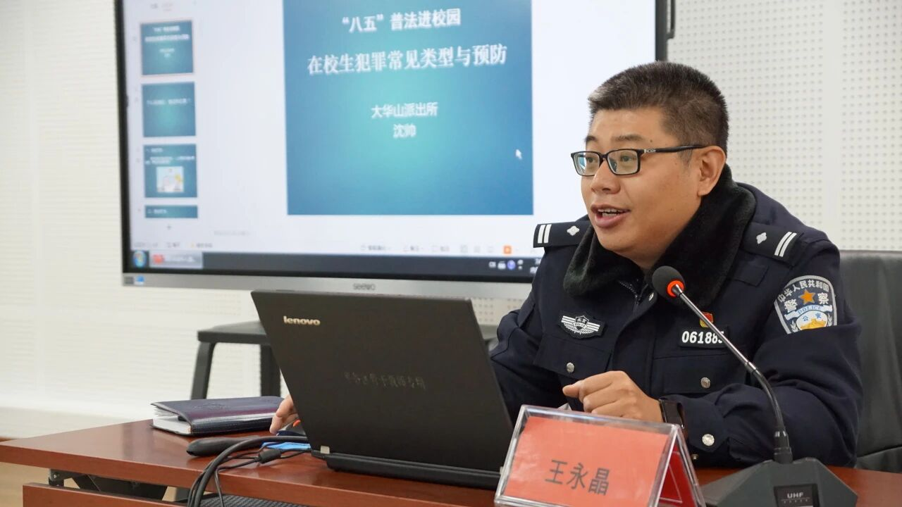 大华山镇派出所所长王永晶带来《“八五”普法进校园——在校生犯罪常见类型与预防》专题讲座。他以“违纪-违法-犯罪”的渐进关系为切入点,结合未成年人犯罪案例,深入解析盗窃罪、故意伤害罪等常见罪名,通过刑事责任年龄、犯罪后果承担等法律知识讲解,告诫同学们勿以恶小而为之,并现场传授预防犯罪三步法:识别风险、拒绝诱惑、及时求助。