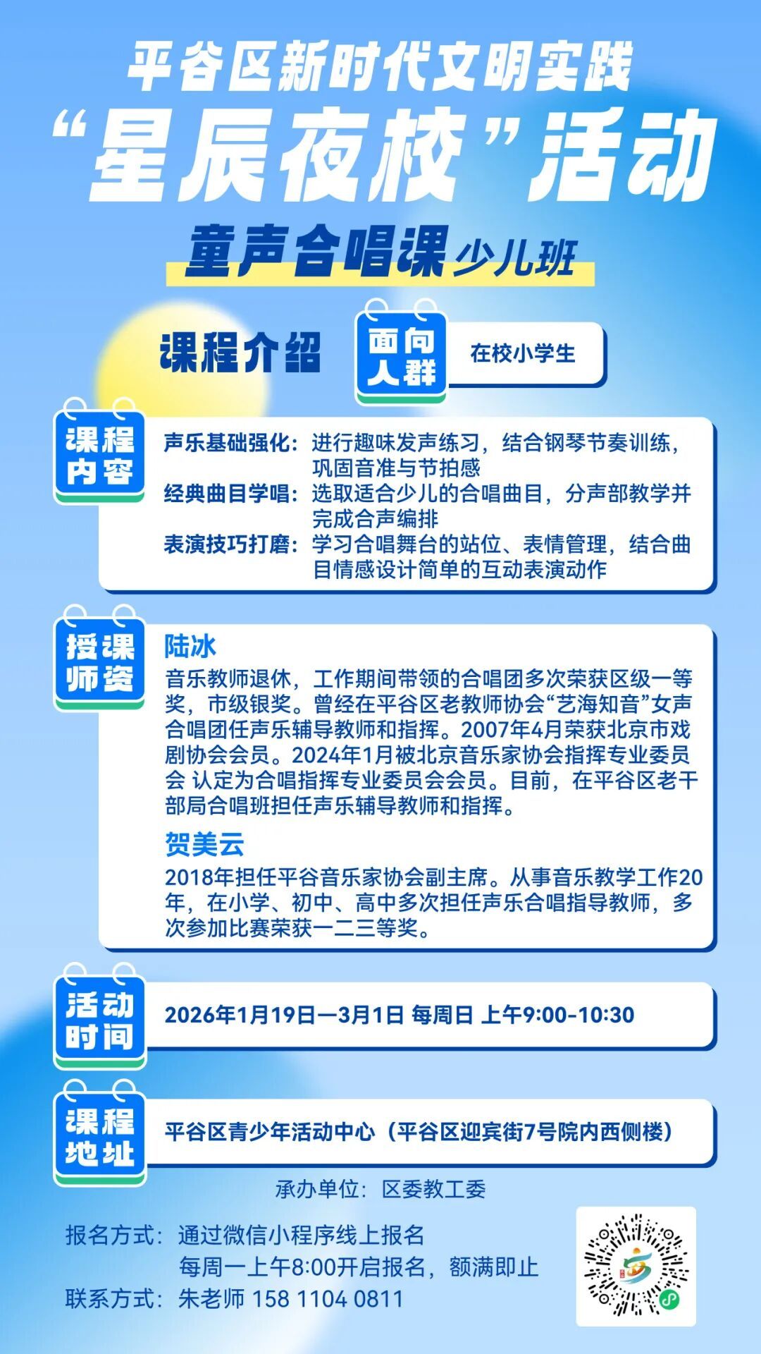 上课地点:平谷区青少年活动中心合唱教室(地址:平谷迎宾街7号,院内西侧第一栋楼)