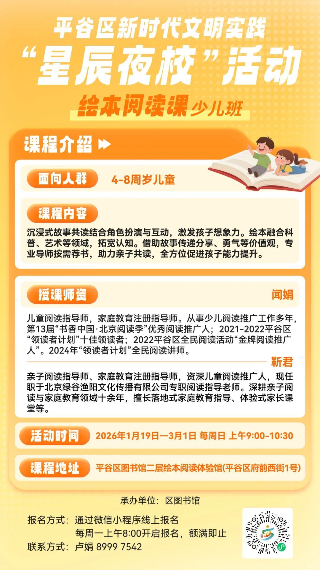 授课师资:由闻娟老师主讲。闻老师是儿童阅读指导师、家庭教育注册指导师,荣获“北京阅读季优秀阅读推广人”、“平谷区金牌阅读推广人”等多项称号,是儿童阅读领域的专家,深受家长和孩子们的喜爱。