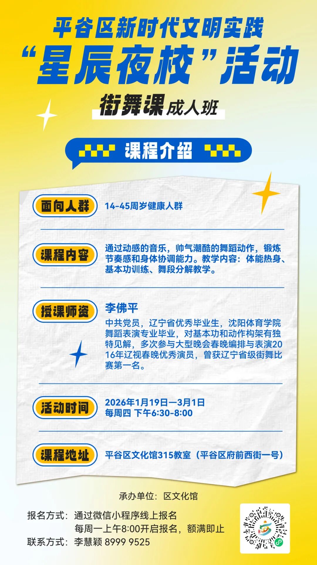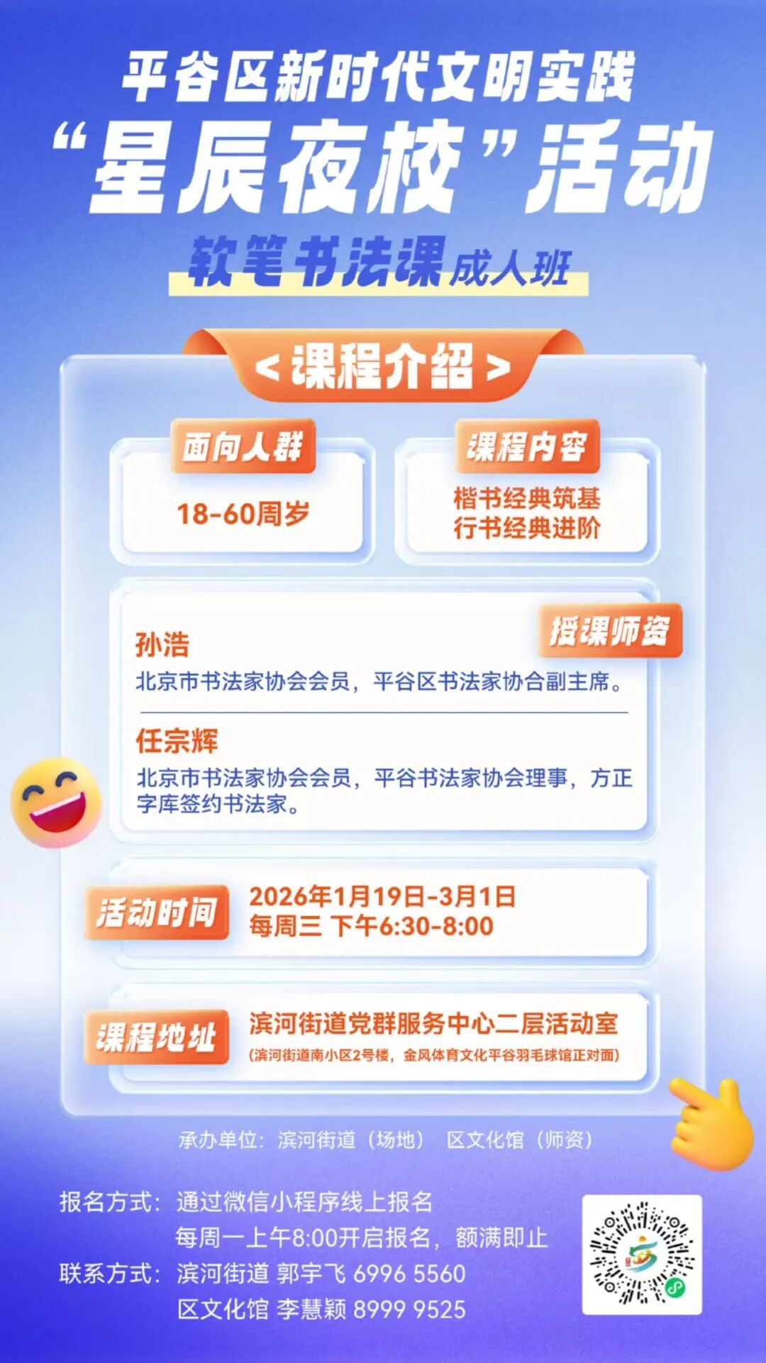有意向的市民朋友,通过“平谷区新时代文明实践小程序”报名参加,名额有限,具体报名方式见课程海报,可咨询联系人进行报名确认。