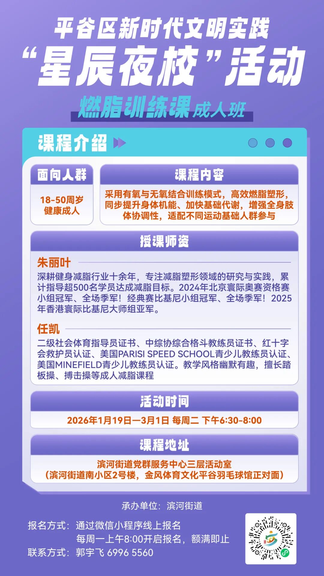 上课地点:滨河街道党群服务中心二层活动室(地址:滨河街道南小区2号楼,金风体育文化平谷羽毛球馆正对面)