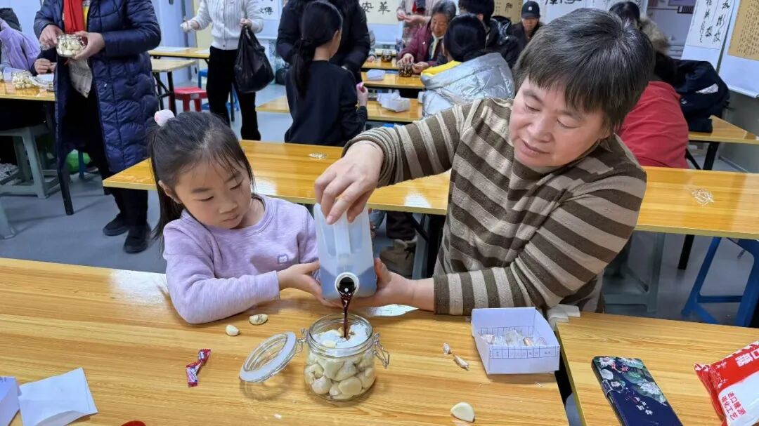 “不仅学会了腌腊八蒜,还和邻居熟络了,太有意义了。”带着小孙女来参加活动的居民李阿姨一边拧紧罐盖,一边笑着分享。老人和孩子们围在一起忙活不停,你一言我一语交流着各家的腊八习俗,畅谈新年规划,欢声笑语此起彼伏。一瓶瓶灌满洁白蒜瓣与酸甜料汁的玻璃罐被逐一封存,罐中不仅承载着腊八节的传统味道,更将醇厚的邻里情谊与对新春的美好期盼,一并锁进了这份专属年味里。