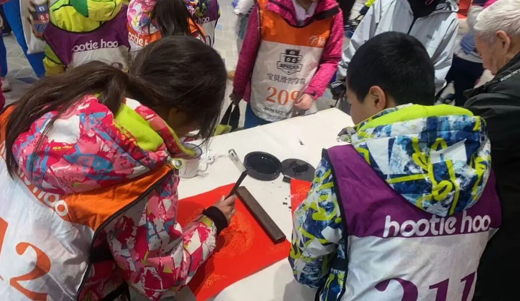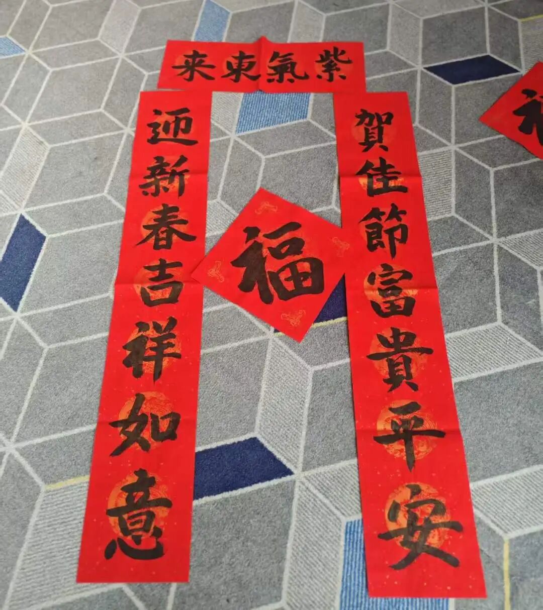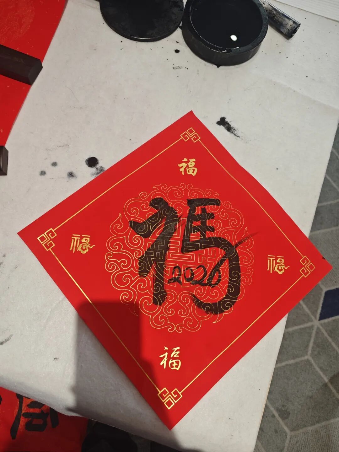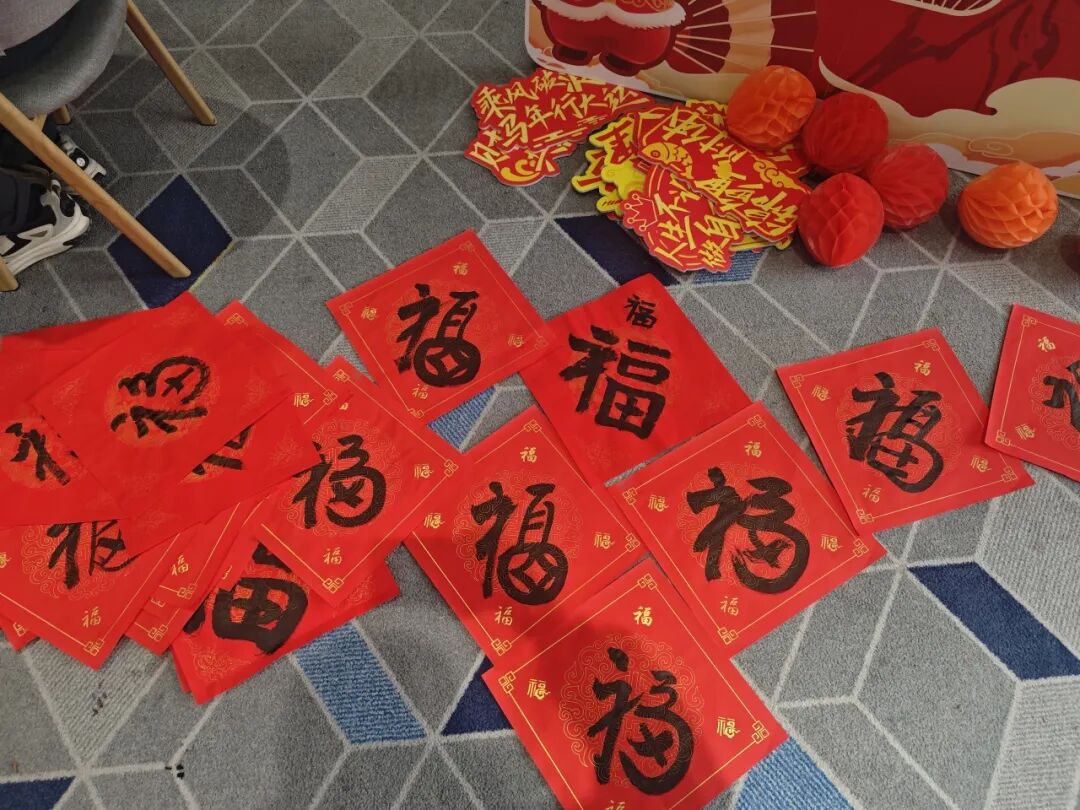 活动现场墨香四溢,书法老师们精神饱满、挥毫泼墨,笔锋流转间,一幅幅对仗工整、寓意吉祥的春联,一个个饱满圆润、喜庆大气的“福”字跃然纸上,尽显书法艺术的独特魅力。孩子们在老师的悉心指导下,也兴致勃勃地拿起毛笔,从握笔姿势学起,一笔一划认真临摹,稚嫩的笔触中满是对传统文化的热爱,用笔墨勾勒对新春的期盼。红彤彤的春联与福字整齐铺满桌面,映衬着大家的笑容,现场洋溢着热闹红火、温馨祥和的节日气息。
