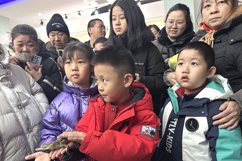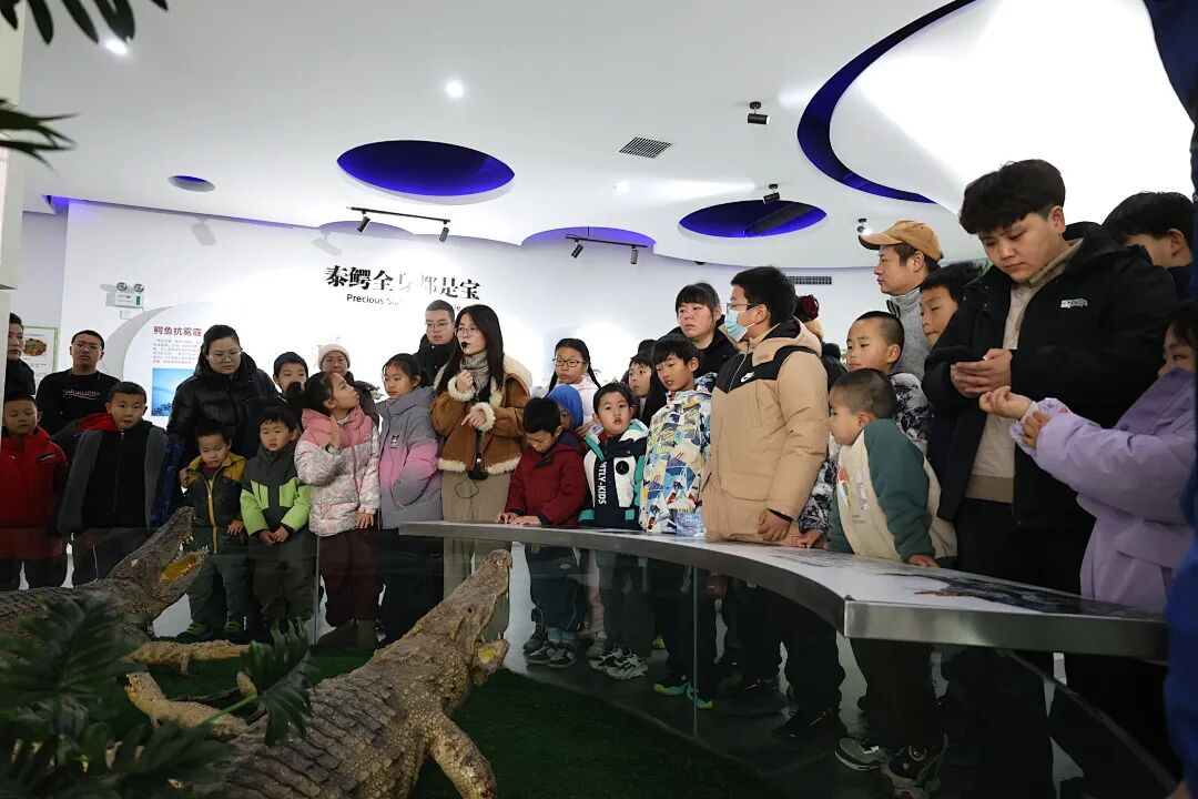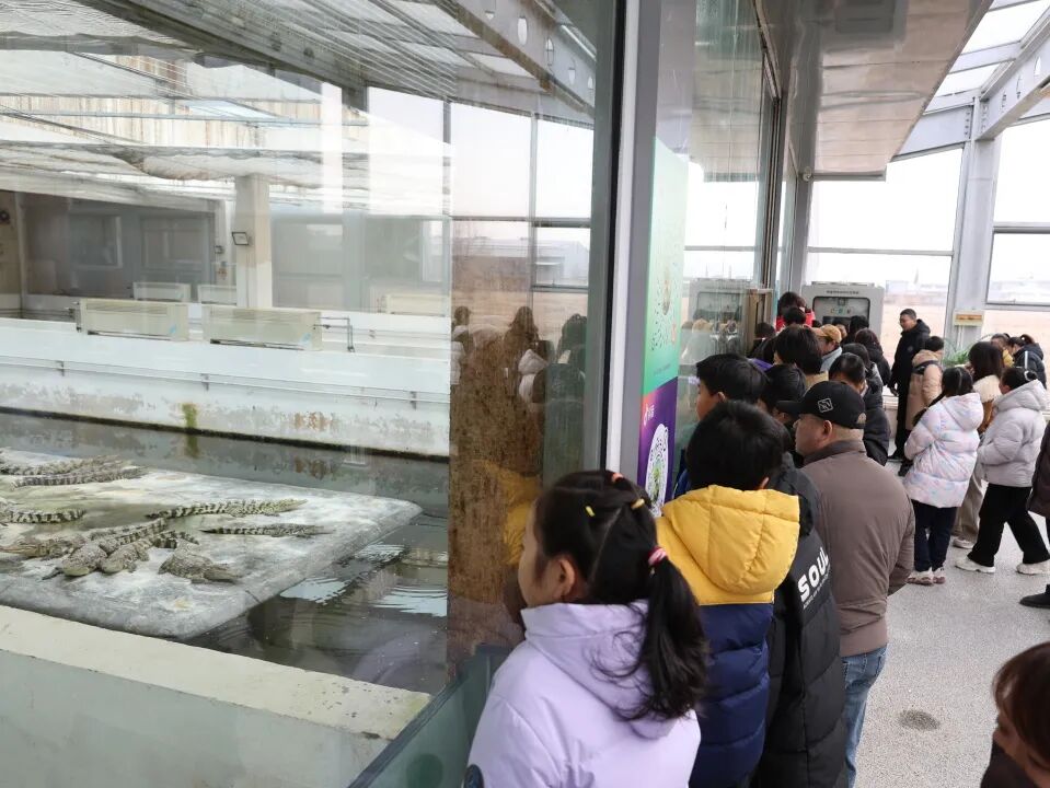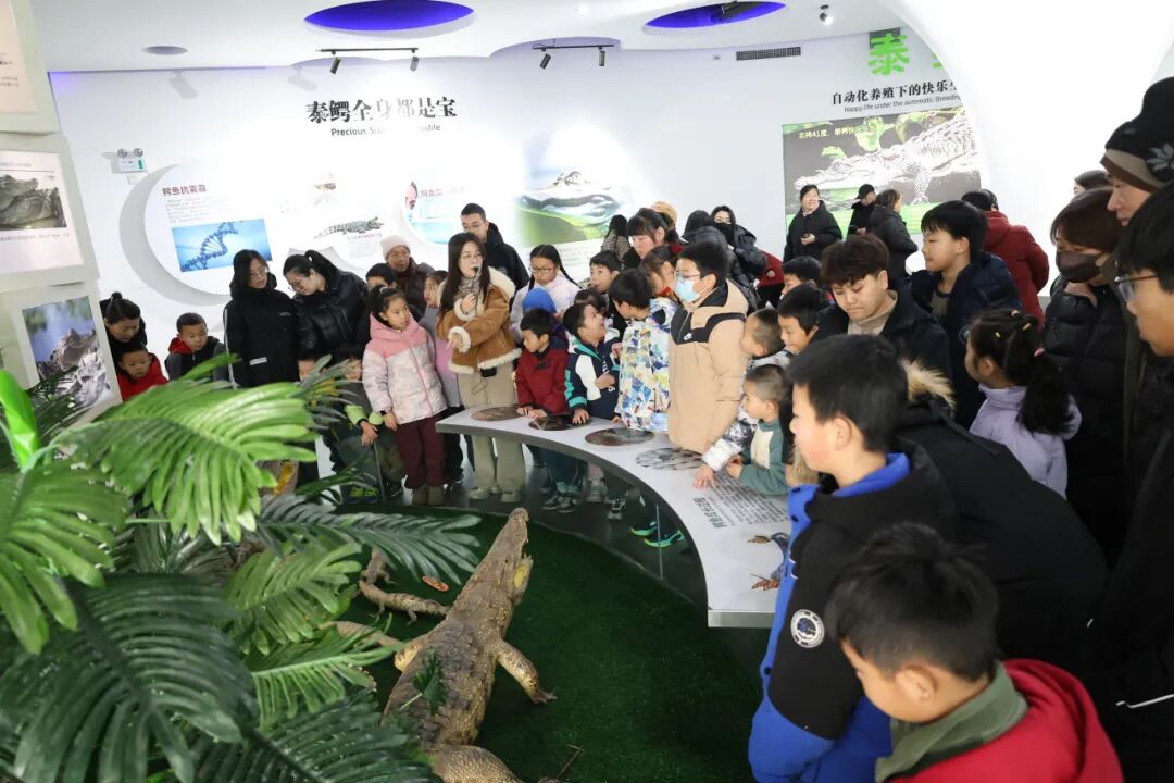 在高纬度养殖区,孩子们好奇地驻足观察热带鳄鱼的生活状态,直观感受科技为跨纬度养殖带来的突破与改变。