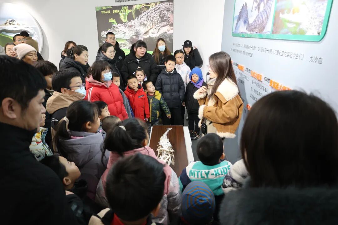 科普讲解环节干货十足,讲解员化身“科普向导”,不仅细致介绍了鳄鱼进化史、繁育秘闻,还特别分享了鳄鱼作为“几乎不患癌症的动物”的独特特性,详解了鳄鱼蛋的孵化条件与发育过程。现场展示的鳄鱼骨标本更是勾起了孩子们的好奇心,大家纷纷凑近观察、触摸感知。互动问答环节,孩子们与家长围绕鳄鱼特性、养殖技术等问题踊跃举手,现场氛围十分热烈。