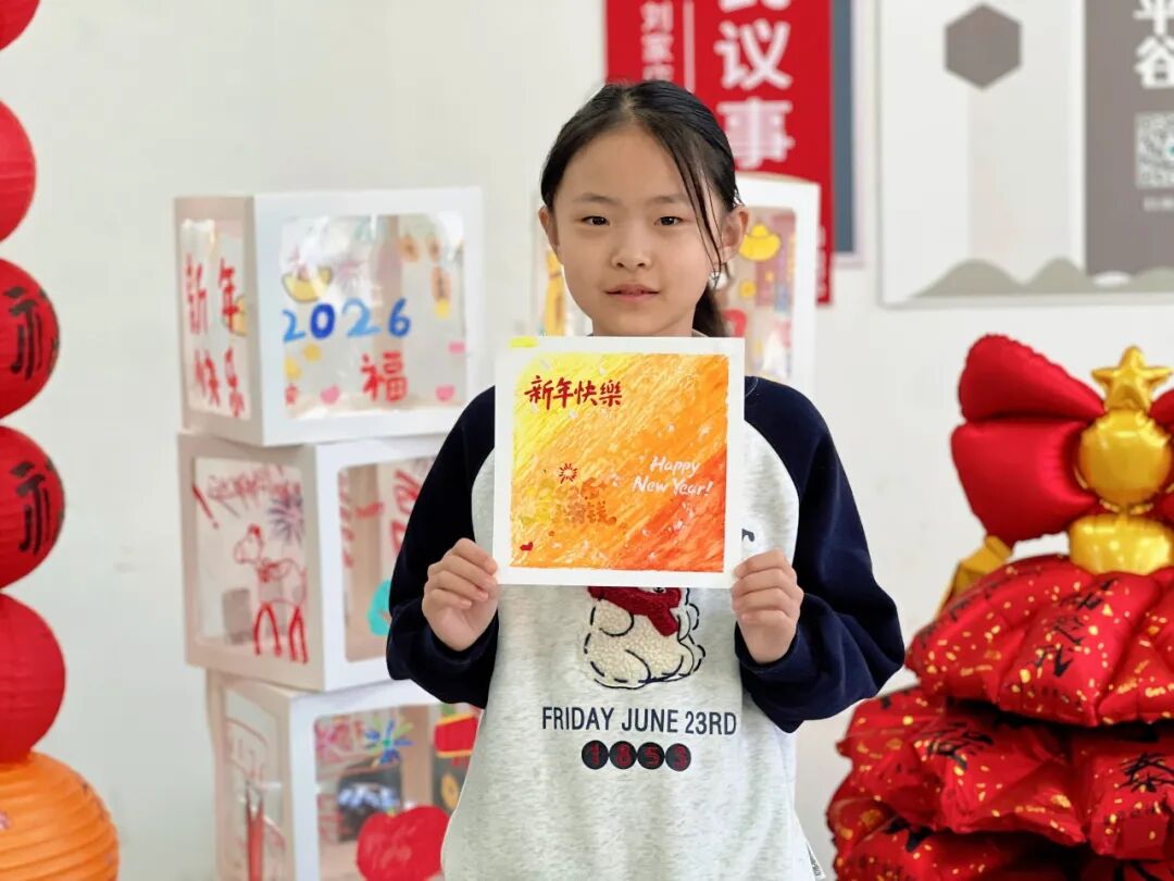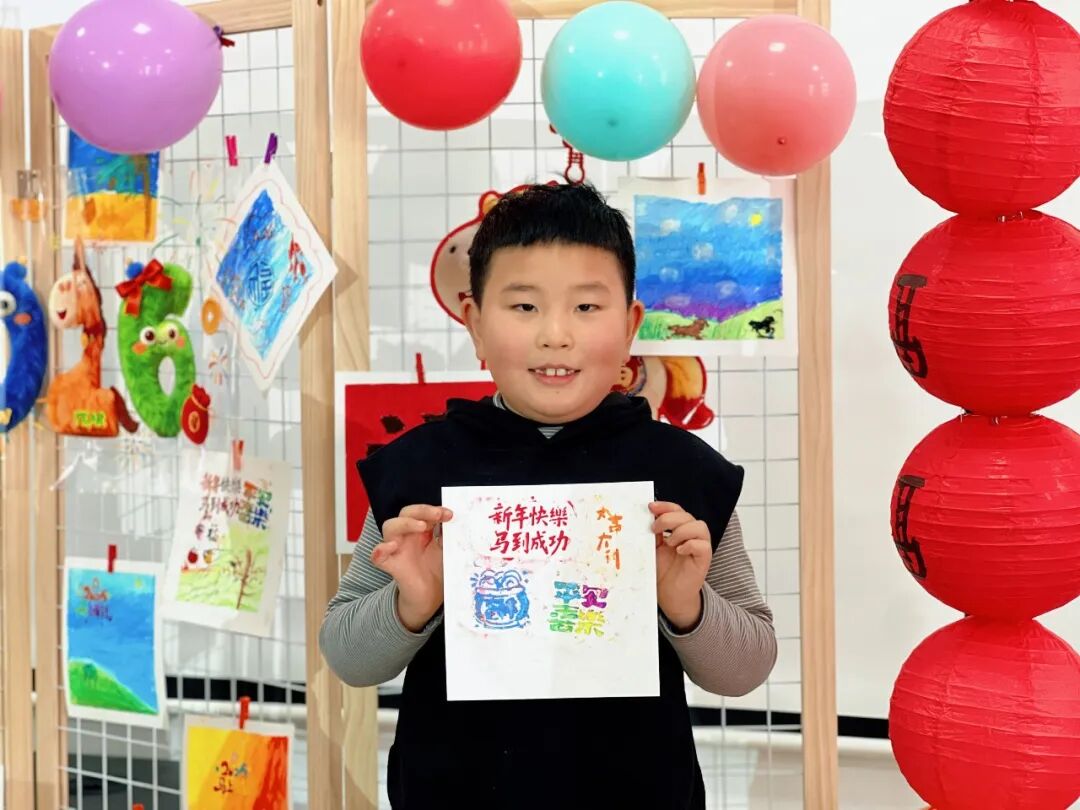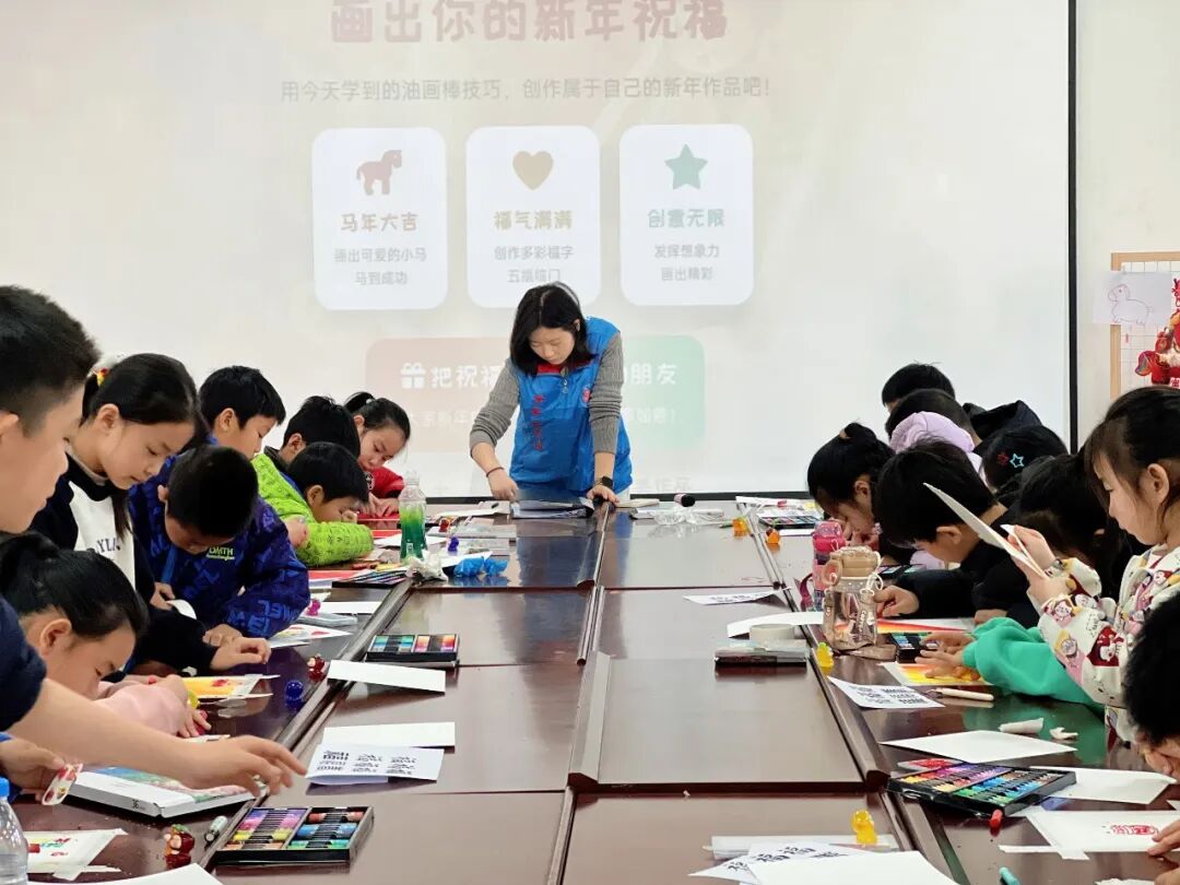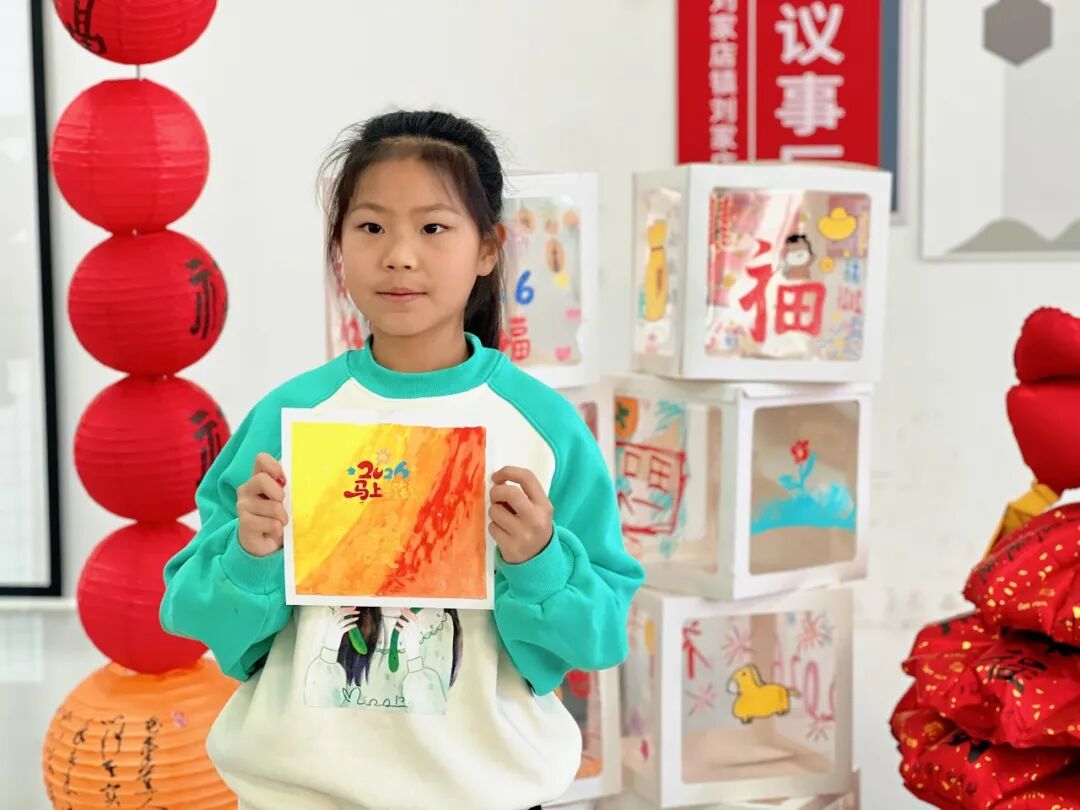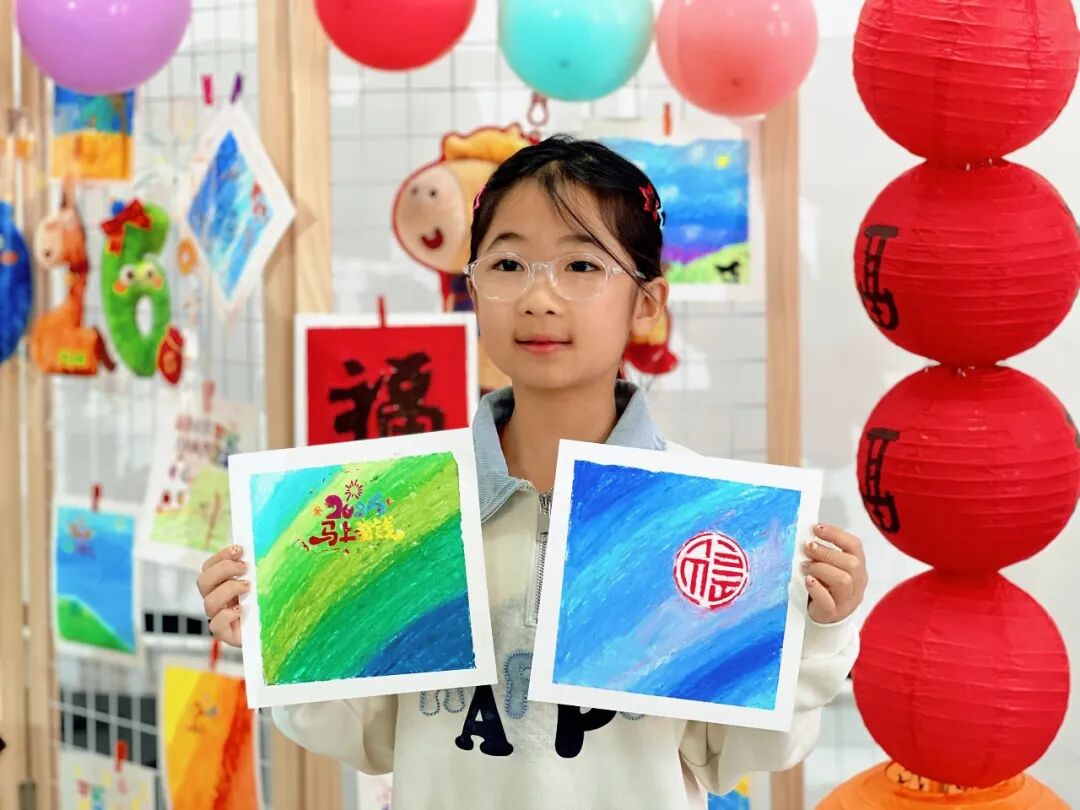 民俗科普结束后,创意油画年画环节正式拉开帷幕。老师早已备好油画棒、油画纸,以“小马迎春”为主题,耐心指导同学们勾勒线条、调配色彩。有的让小马依偎在桃枝旁,融入桃乡特色,寓意“桃李芬芳+马到成功”;还有的为小马搭配红灯笼、福字等元素,让画面满是新春喜庆。当一幅幅色彩艳丽的迎春画作完成时,同学们纷纷举起作品展示,脸上洋溢着满满的成就感,画室里回荡着欢快的笑声。