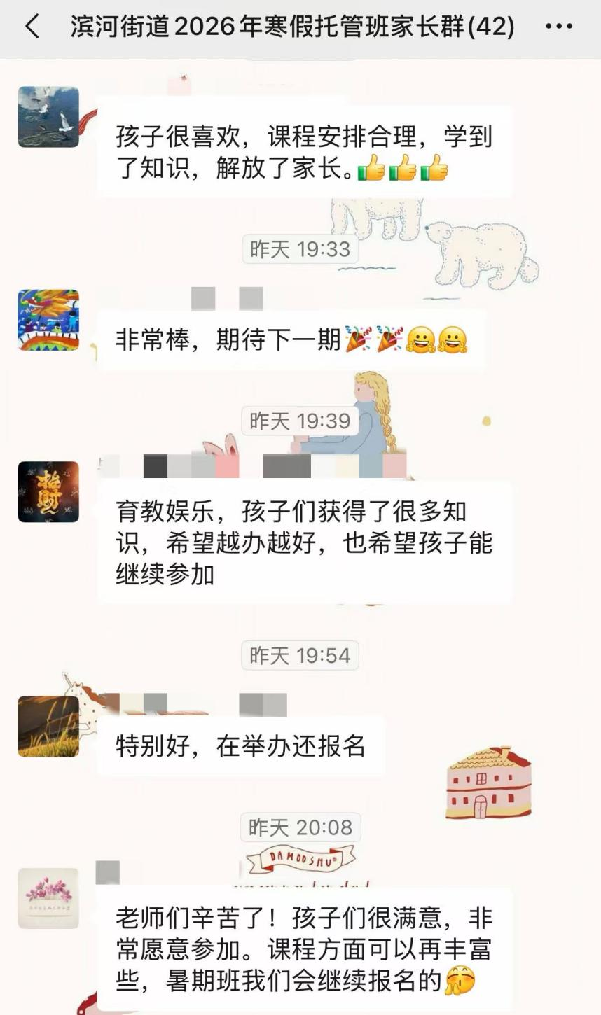 2026年1月26日到2月6日,滨河街道党群服务中心寒假托管班为25名6—12岁儿童提供暖心看护与成长陪伴,受到家长普遍欢迎与孩子们的热烈喜爱。