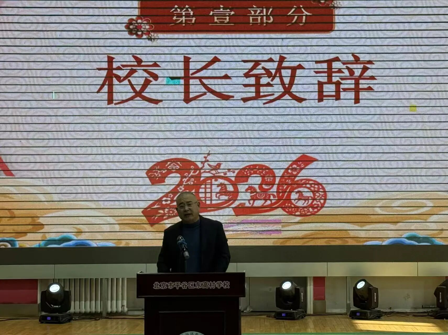 熊万水校长登台致辞,深情致谢全体东高村教育人:感念任课教师深耕课堂、班主任恪尽职守、教辅后勤默默奉献,感恩新老教师携手同行,愿大家新春安康、阖家幸福,共赴新学期新征程,共绘学校发展新辉煌。