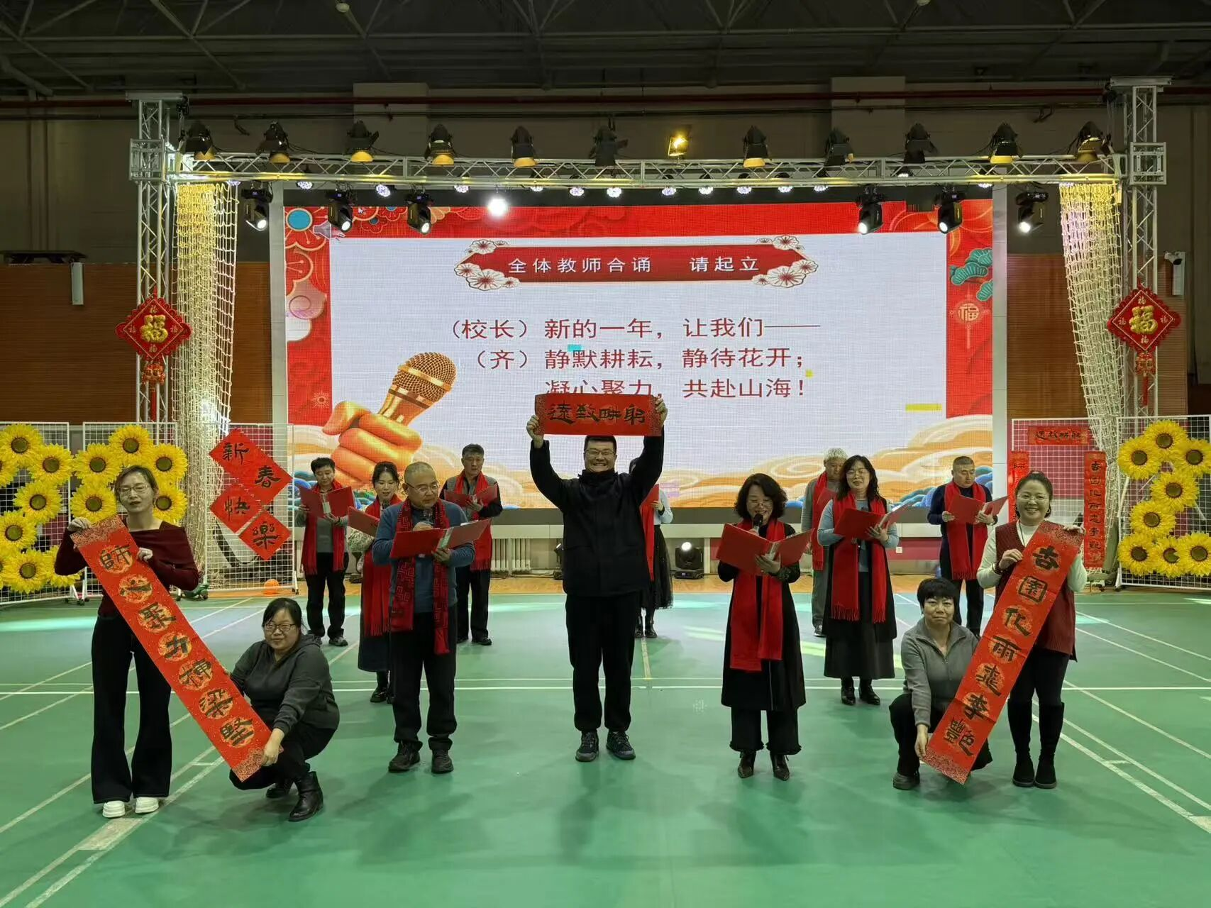 干部团队带来诗朗诵《躬耕者之歌》。当“以初心为笔,以汗水为墨,继续书写关于成长、爱与希望的永恒诗篇”的深情词句响起,干部团队带领全体教师共同合诵,铿锵有力的声音里,满是教育躬耕者扎根讲台的坚守与担当,更彰显出学校管理团队凝心聚力、引领全校向阳生长的坚定决心。