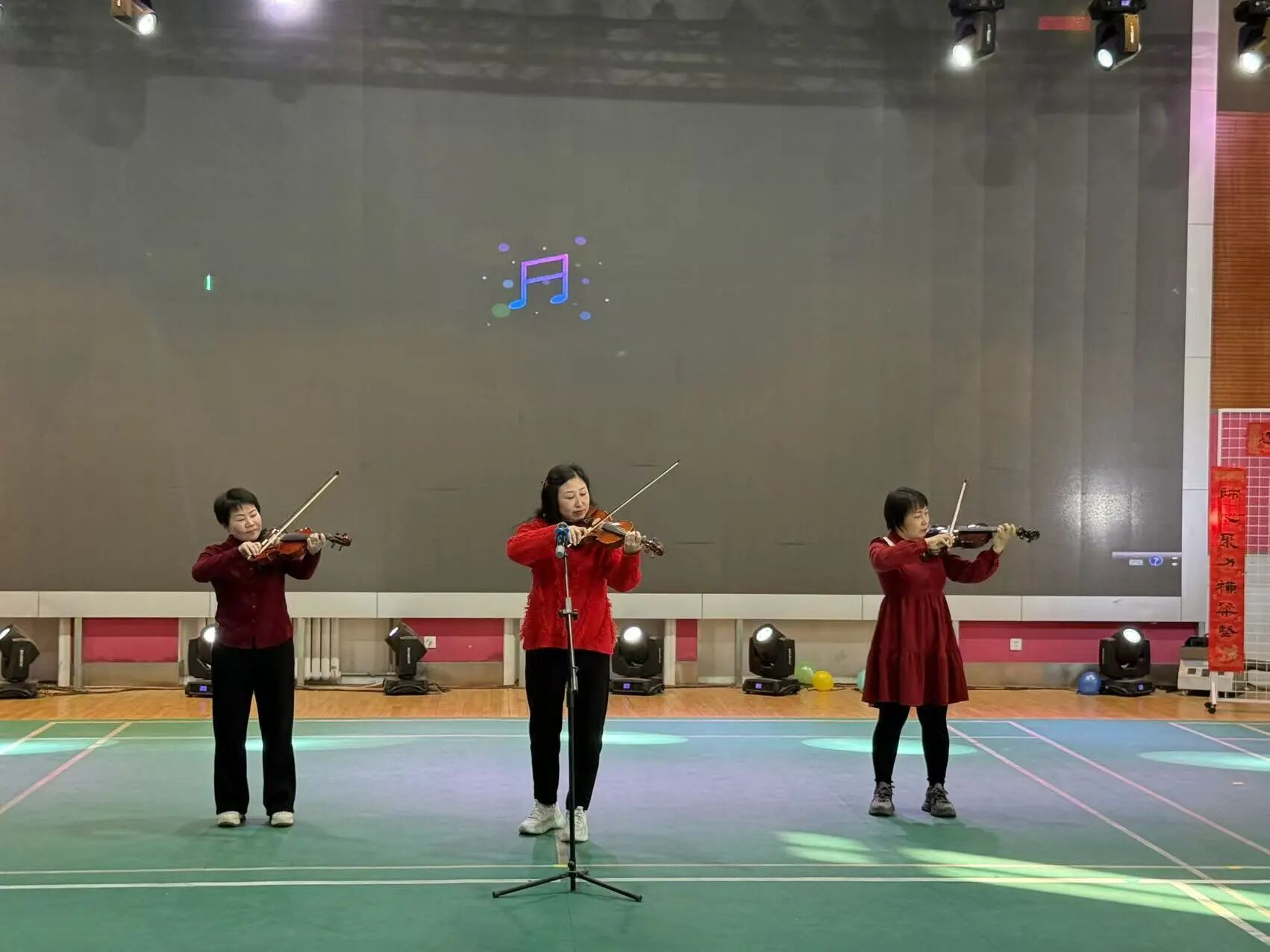 小学部陈慧慧老师携手教师团队带来小提琴合奏《我和我的祖国》。悠扬的琴声流淌,爱国情怀在旋律中传递,全体教职工轻声和唱,将对祖国的热爱、对教育的忠诚融入每一个音符,现场氛围庄重而温暖。