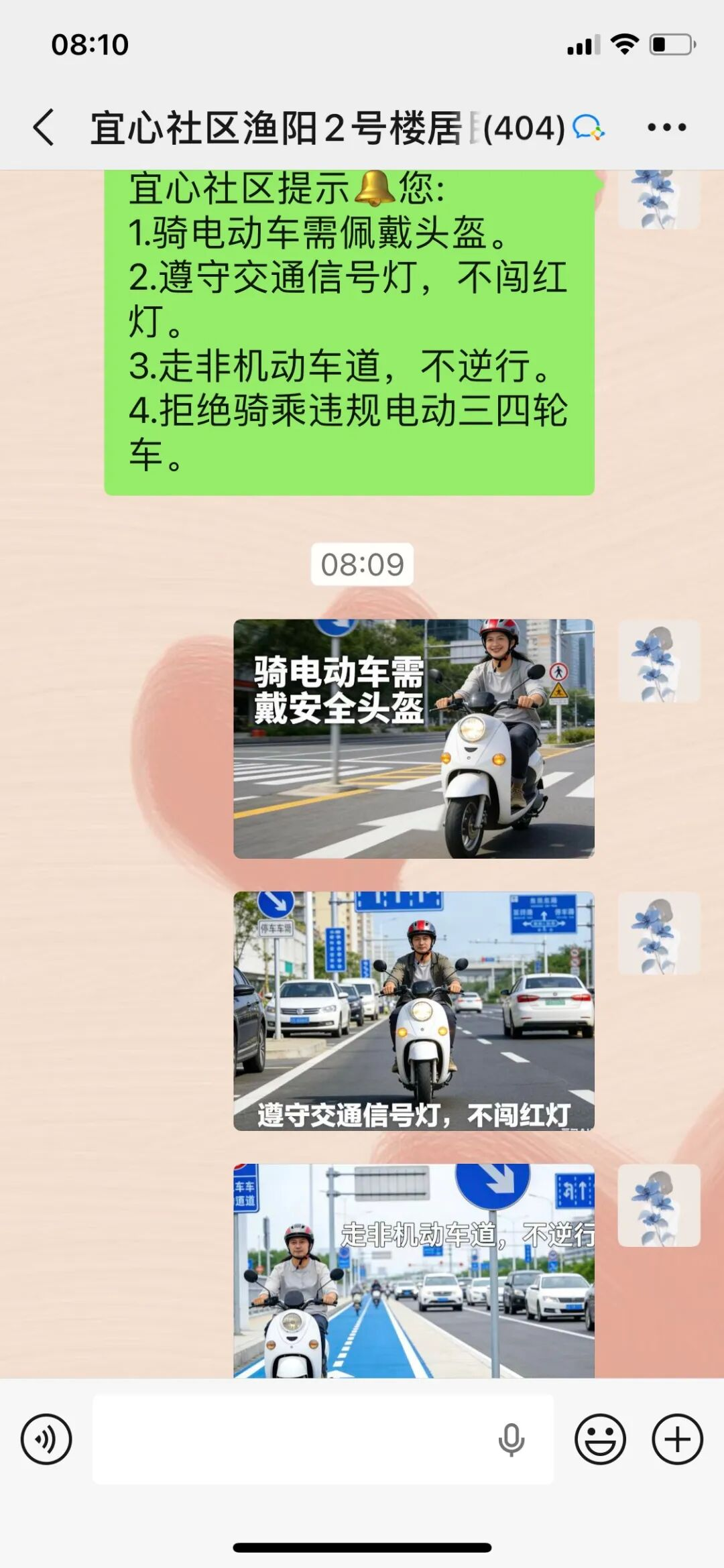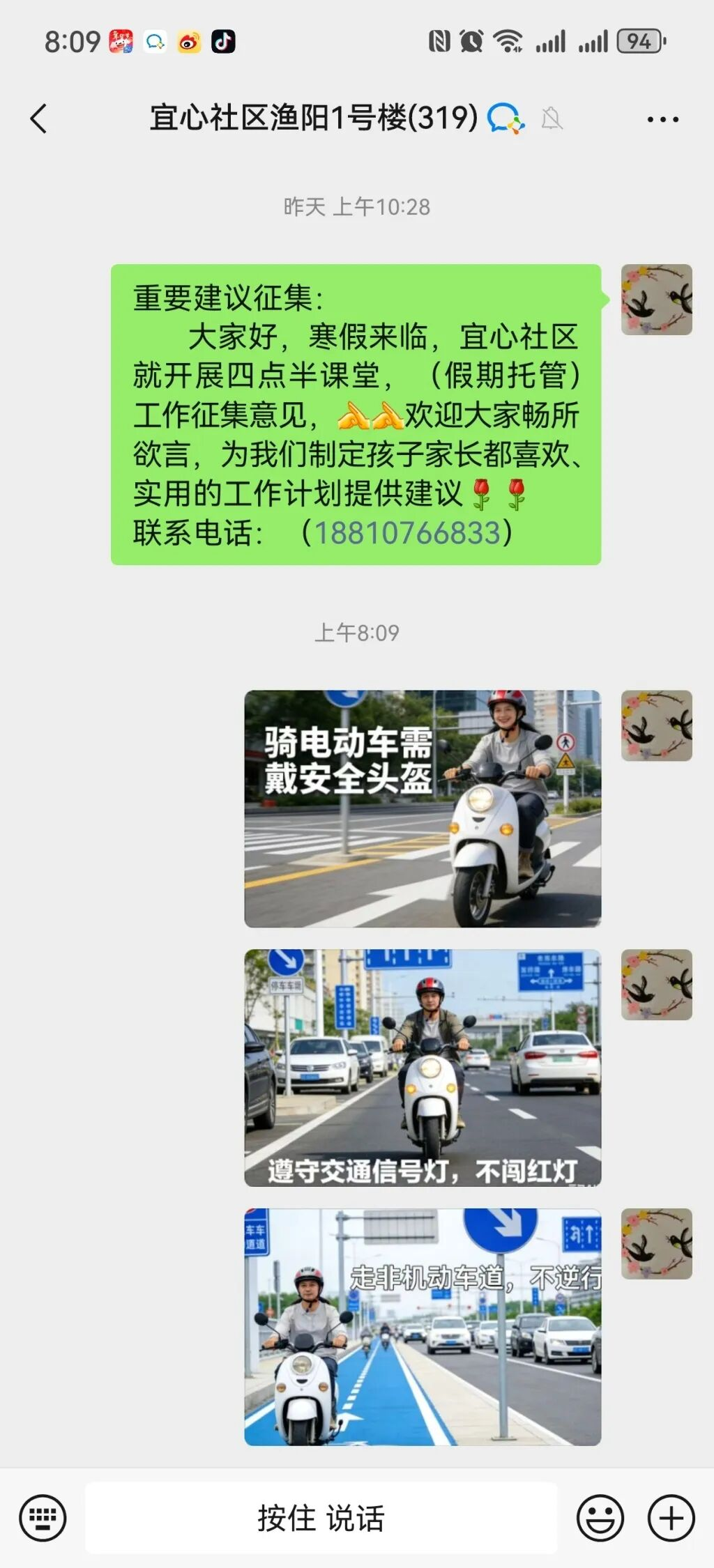 线上宣传方面,社区充分发挥网格群“覆盖面广、传播迅速”的优势,由网格员在各居民网格群内持续推送电动车安全出行常识、典型事故案例短视频、头盔正确佩戴图解等宣传内容,提醒居民时刻绷紧交通安全弦,让安全知识突破时空限制,精准触达每一户家庭。