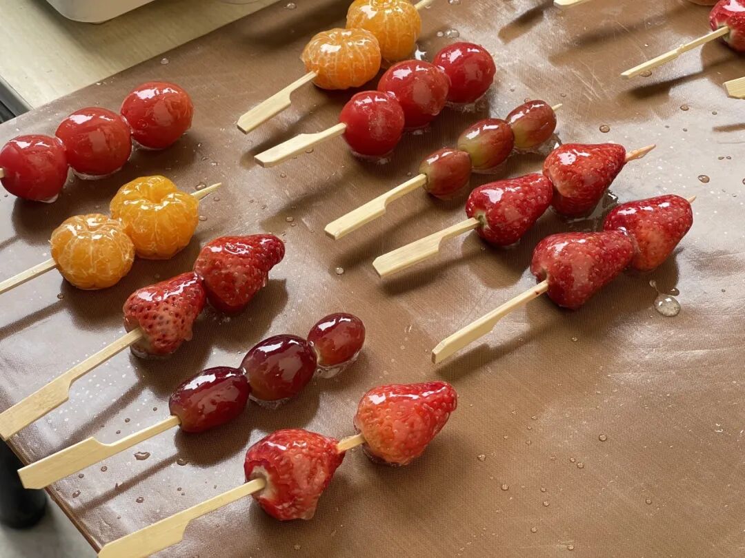 绘本分享结束后,备受期待的糖葫芦制作环节随即展开。工作人员精心准备了草莓、葡萄、橘子、圣女果等新鲜水果,现场演示传统冰糖葫芦的制作技艺。从水果的处理、串果的技巧,到糖浆的熬制、裹糖的火候,每一个步骤都体现着传统手艺的精妙。看着晶莹剔透的糖浆在阳光下泛着琥珀色的光泽,均匀地包裹住色彩缤纷的果实,孩子们眼中闪烁着好奇与欣喜的光芒。在工作人员的指导下,孩子们亲手体验了水果串制的过程,感受传统美食制作的乐趣。