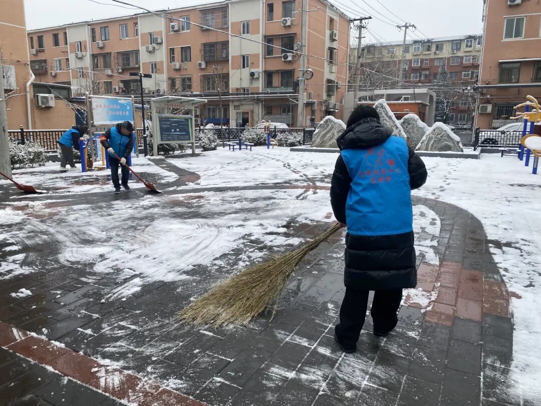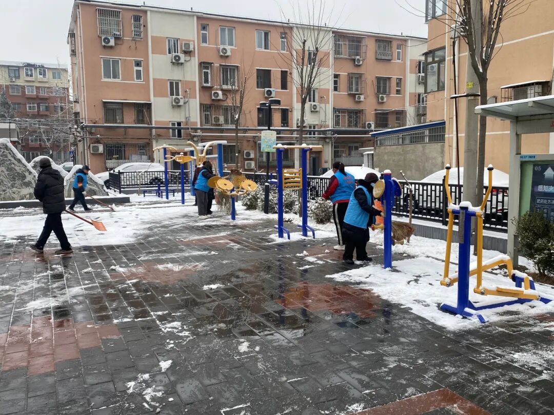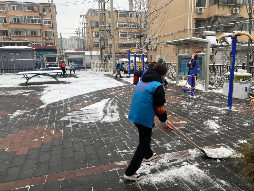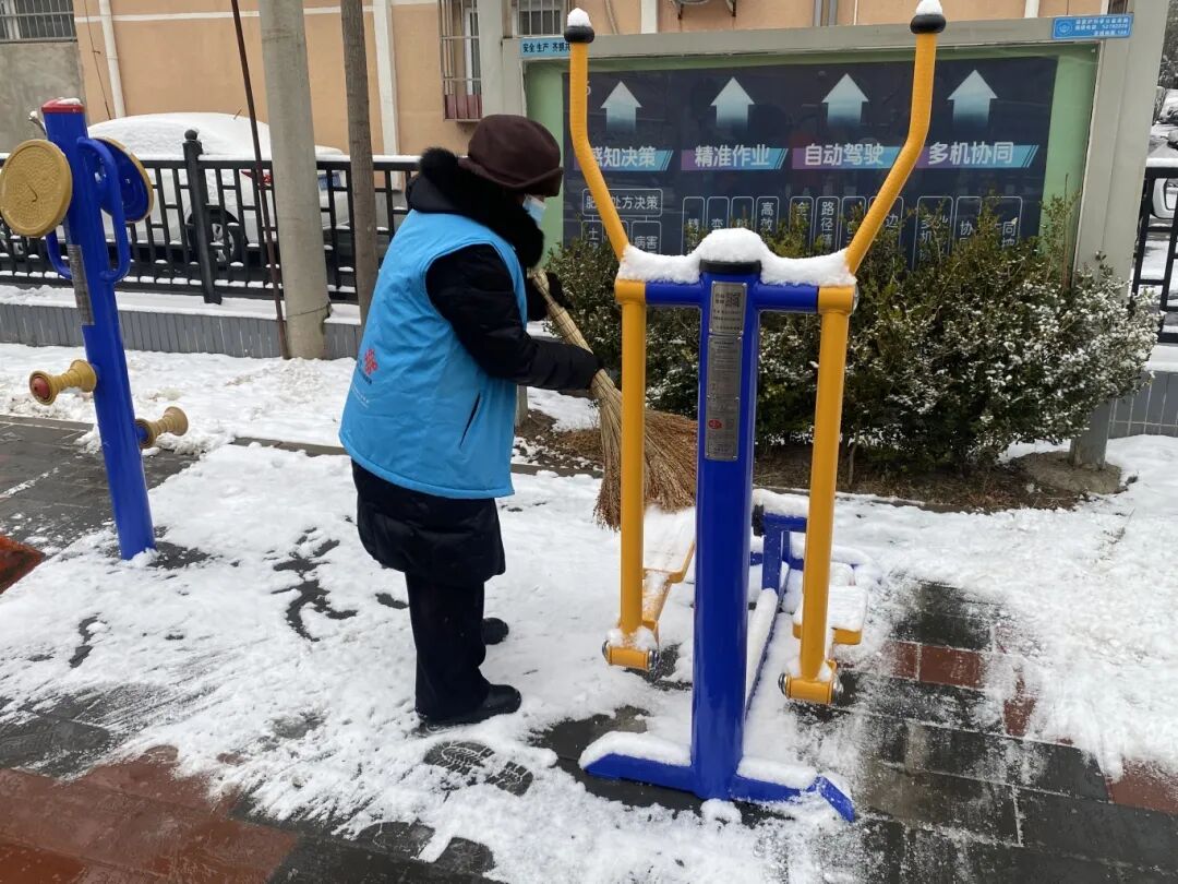 扫雪铲冰小队,志愿者们手持除冰铲、扫帚等清洁工具,对小区主干道、楼区健身园等重点区域进行扫雪铲冰志愿服务,及时消除出行隐患。