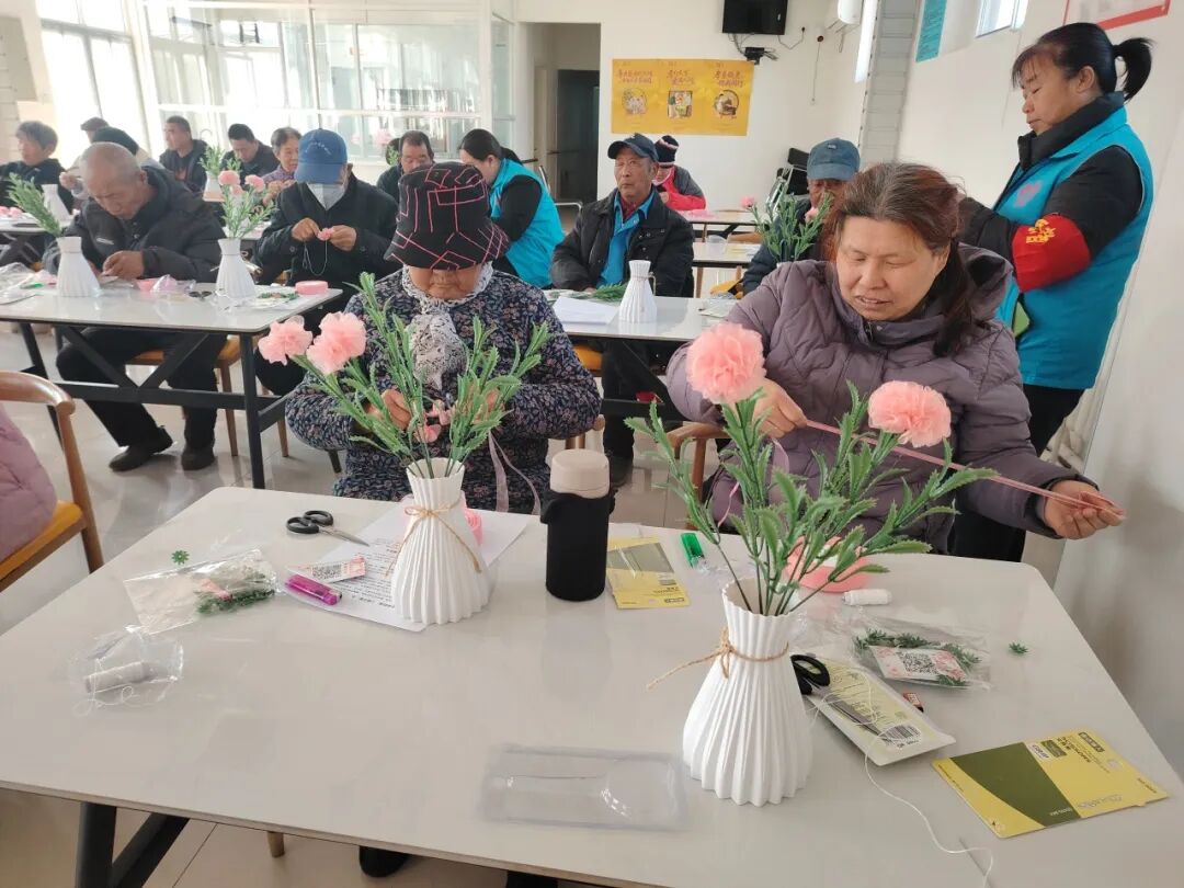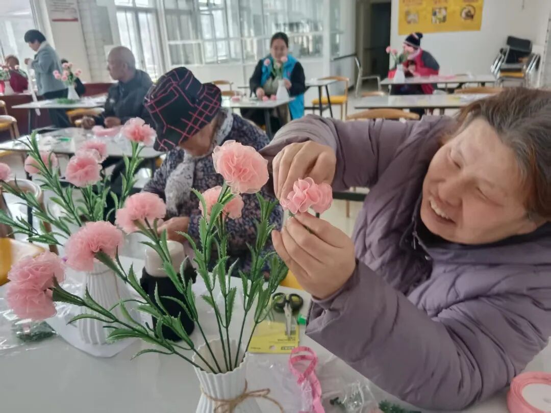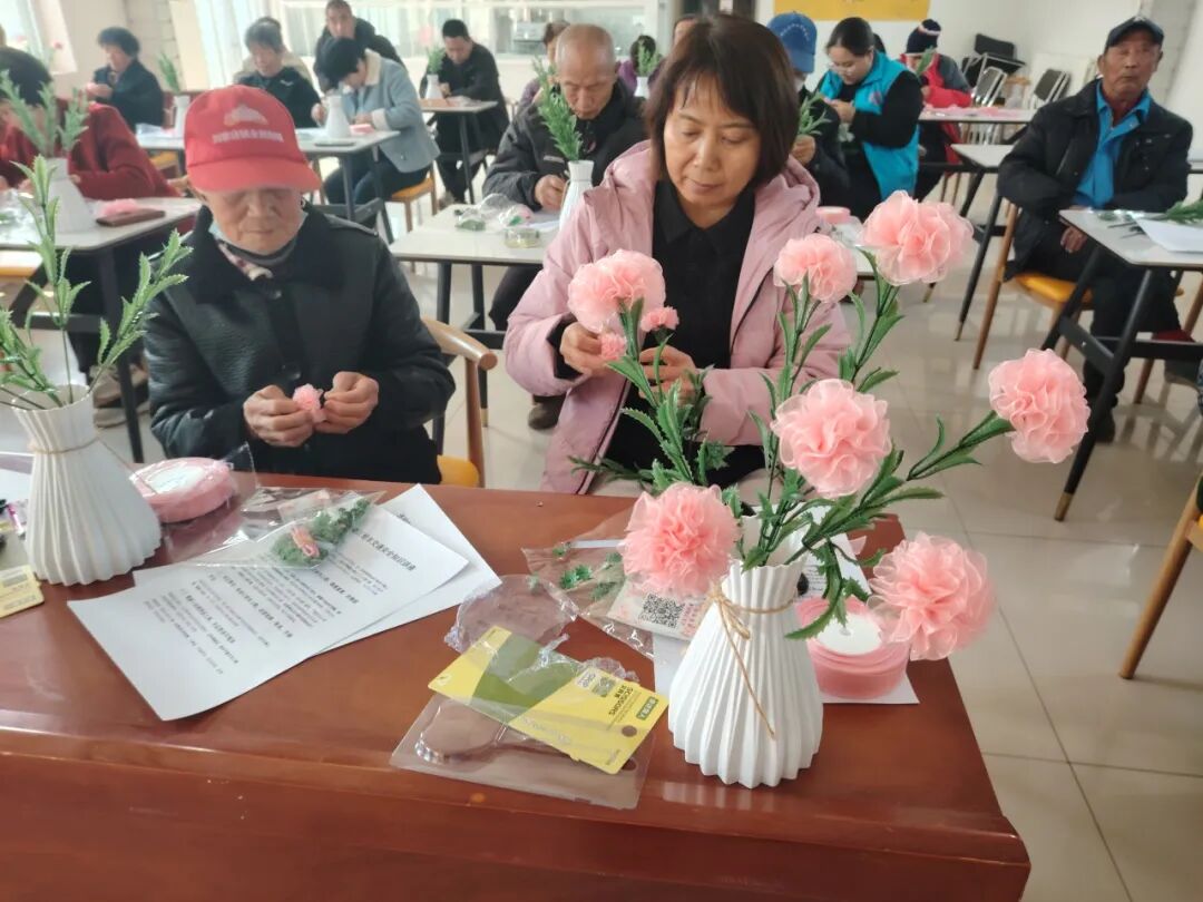 大家听得认真、学得投入,纷纷动手实践起来。裁剪丝带、卷出花瓣、粘贴固定、整理花型,一系列动作有条不紊。有的互相交流技巧,有的主动帮助操作不熟练的伙伴,现场欢声笑语不断,处处洋溢着互助友爱的温暖氛围。一条条粉色丝带在大家的巧手中化作一朵朵栩栩如生、娇艳动人的康乃馨。