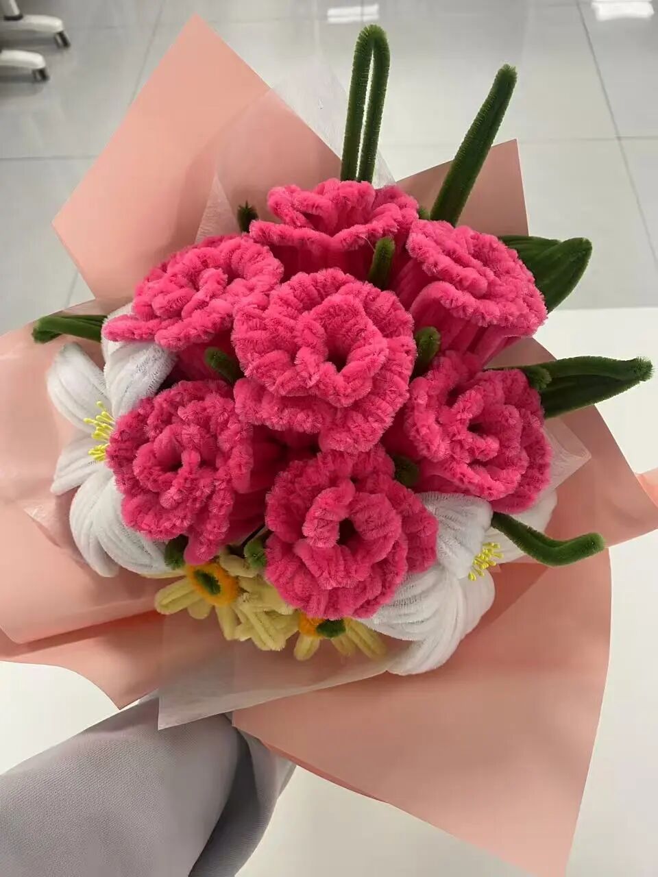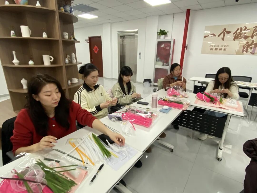 在相互交流与协作中,普通的扭扭棒在巧手下蜕变:粉红色“玫瑰”娇艳饱满,白色“百合”清新脱俗,明黄色“小雏菊”灵动俏皮,搭配翠绿花叶,一束束独具匠心的手工花束渐渐成型。当作品完成时,大家脸上洋溢着成就感与幸福感,纷纷拍照记录这份独特的节日礼物。