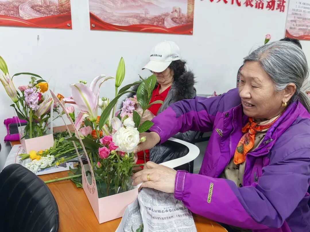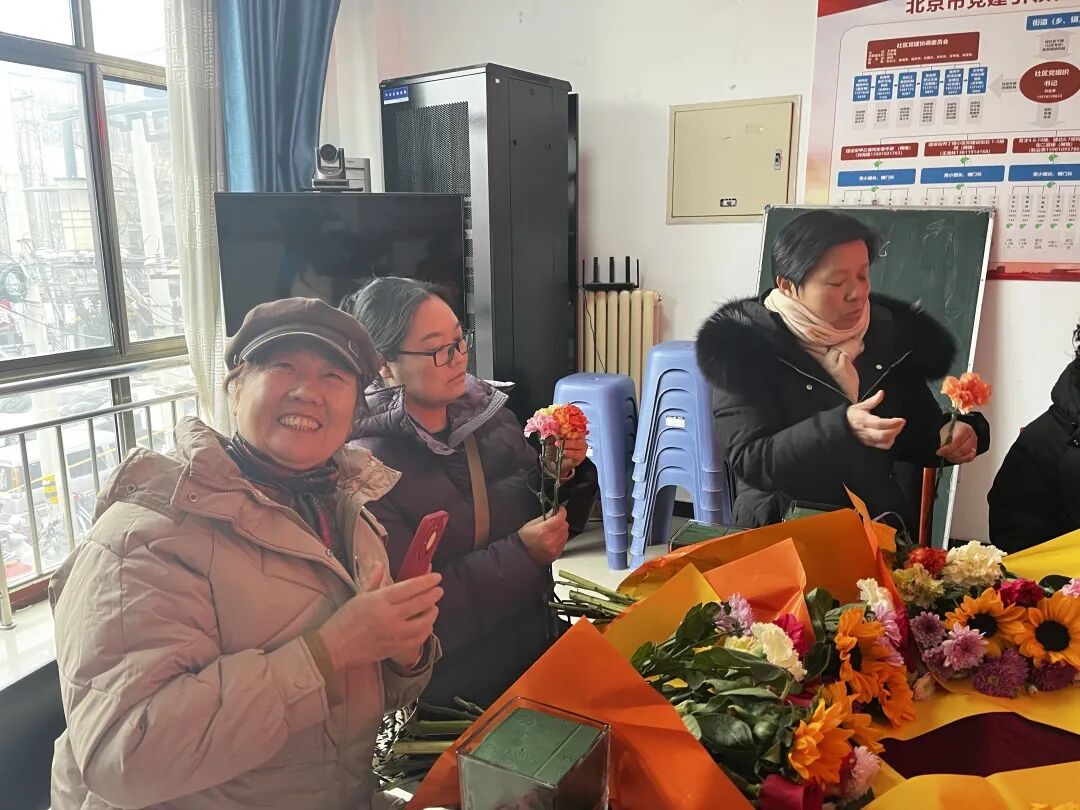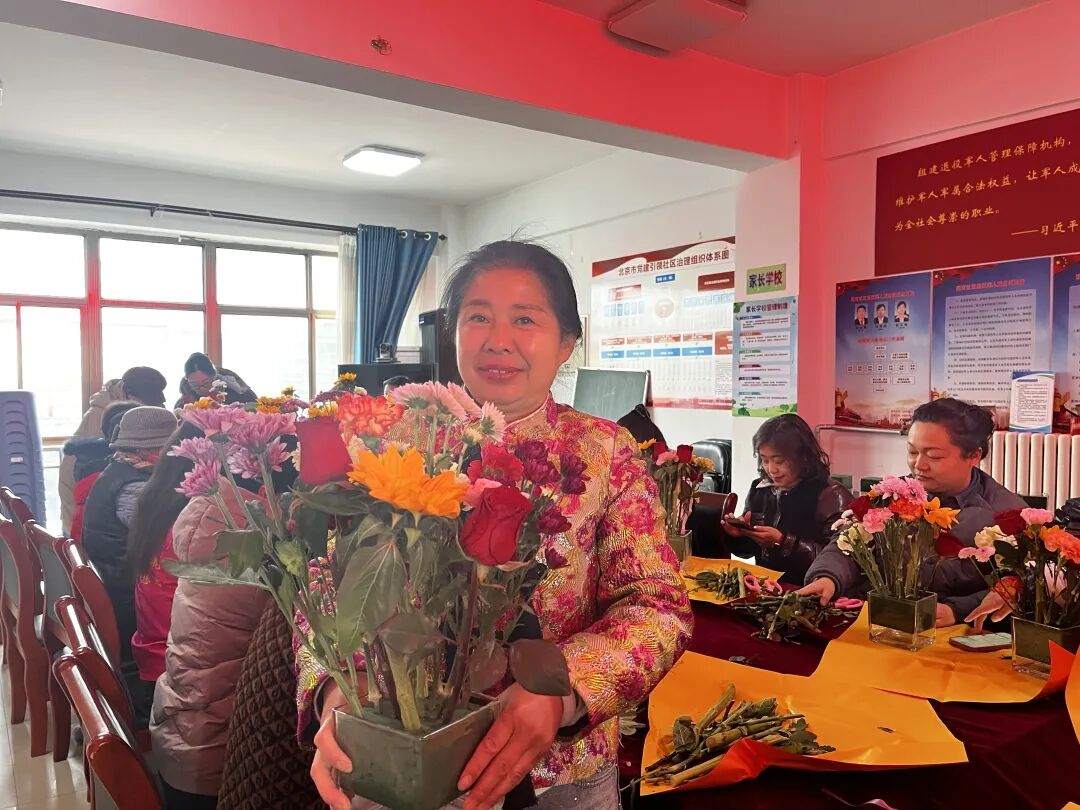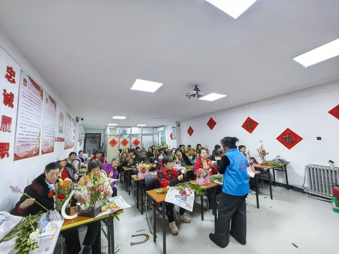 向阳社区主题插花活动,为辖区女性送上节日祝福。活动现场暖意融融、花香弥漫,社区准备了鲜花、花器与工具,邀请花艺老师现场讲解并耐心指导插花技巧,居民们围坐在一起,伴着窗外雪景认真创作、交流互动,窗外白雪与室内繁花相映成趣,大家在欢声笑语中完成了精致的插花作品,度过温馨美好的节日时光。