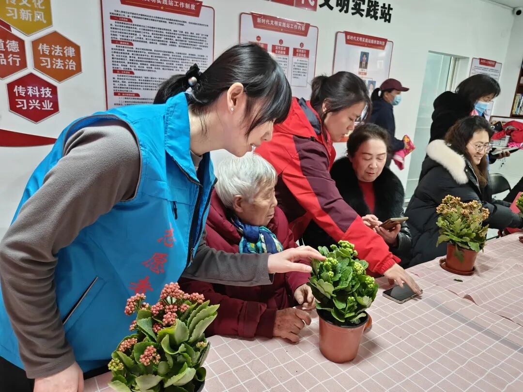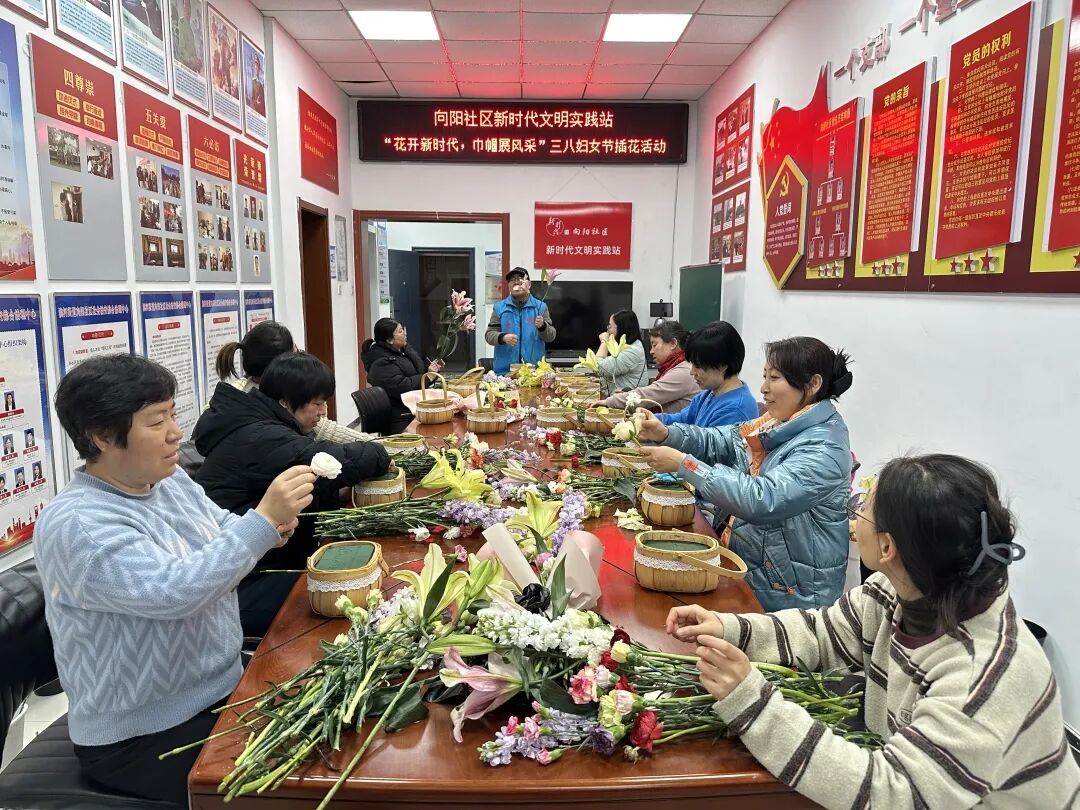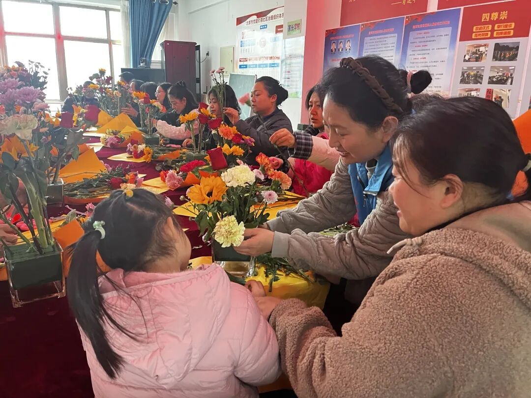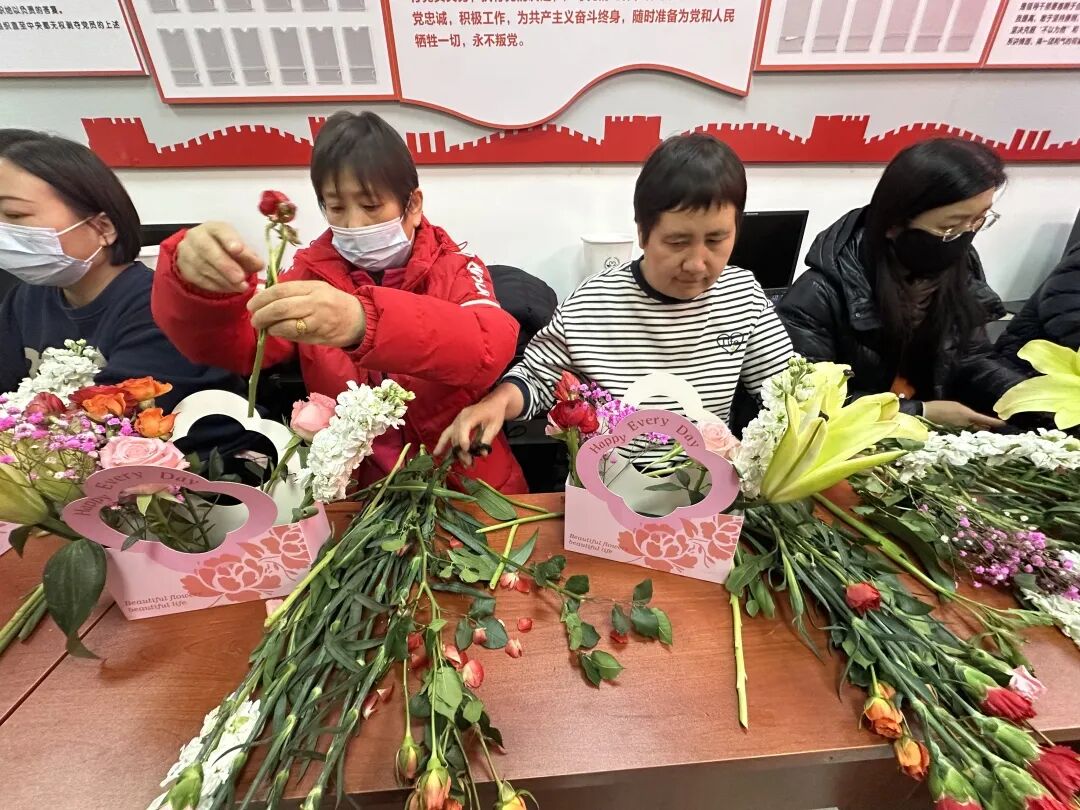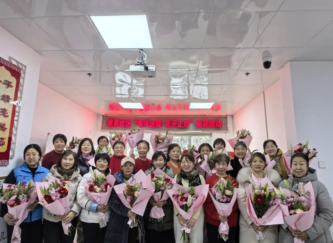 向阳社区主题插花活动,为辖区女性送上节日祝福。活动现场暖意融融、花香弥漫,社区准备了鲜花、花器与工具,邀请花艺老师现场讲解并耐心指导插花技巧,居民们围坐在一起,伴着窗外雪景认真创作、交流互动,窗外白雪与室内繁花相映成趣,大家在欢声笑语中完成了精致的插花作品,度过温馨美好的节日时光。