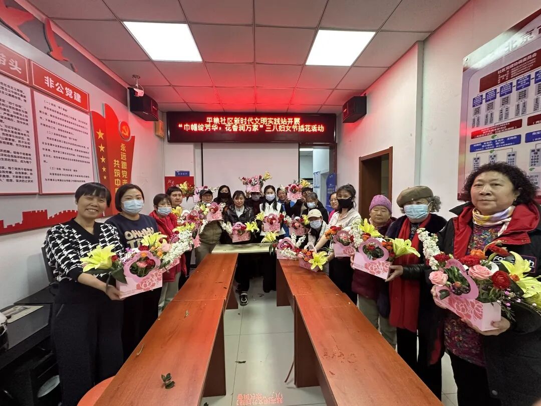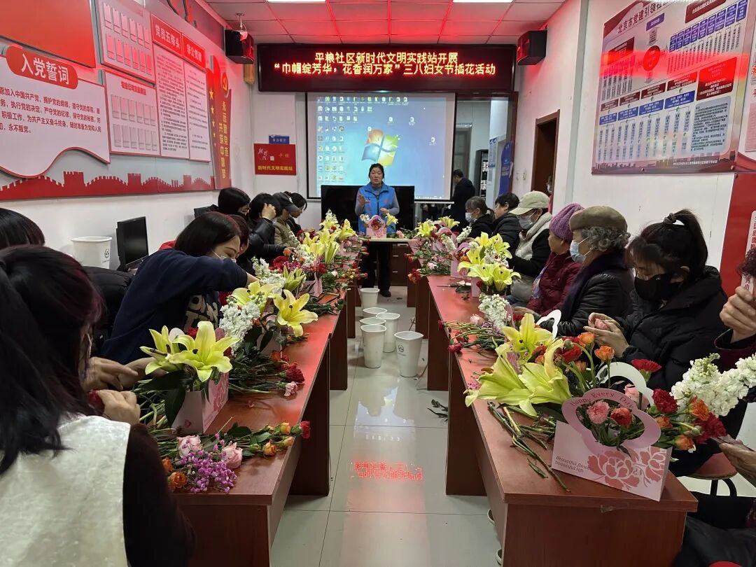 平粮社区三八妇女节插花活动现场氛围热烈,花艺老师详细讲解插花技巧、色彩搭配与鲜花养护知识,并手把手指导大家修剪枝叶、构思造型。居民们兴致盎然地精心创作,完成了一件件独具匠心的花艺作品,大家在欢声笑语中交流互动、舒缓身心、增进情谊,活动后手持花束合影留念,充分展现了社区女性积极向上、优雅自信的精神风貌。
