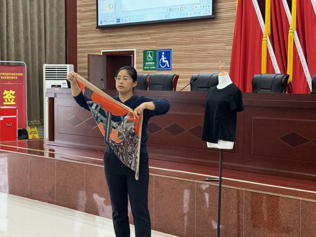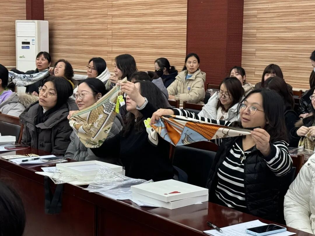 在美丽赋能环节,专业礼仪老师现场教学丝巾多样系法,从配色搭配、场合适配到折叠技巧,一步步示范讲解。大家认真学习、动手实践,在轻松愉悦的氛围中掌握穿搭小技巧,用细节提升气质、展现巾帼风采,现场洋溢着爱美、懂美、创造美的热烈氛围。
