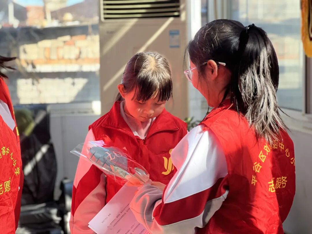 活动期间,恰逢三八国际妇女节临近,为向现场老年女性送上节日关怀,传递温暖与敬意,镇团委特意精心准备了花束与气球。活动尾声,同学们手持鲜艳的花束,走到老人身边,双手将这份心意郑重献上,轻声道一句“节日快乐”,用童真的问候温暖每一位长者的心房,也让雷锋精神与敬老情、节日暖完美交融。