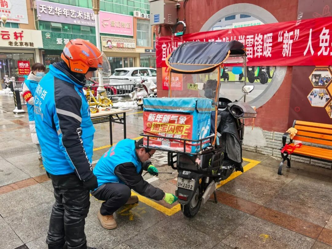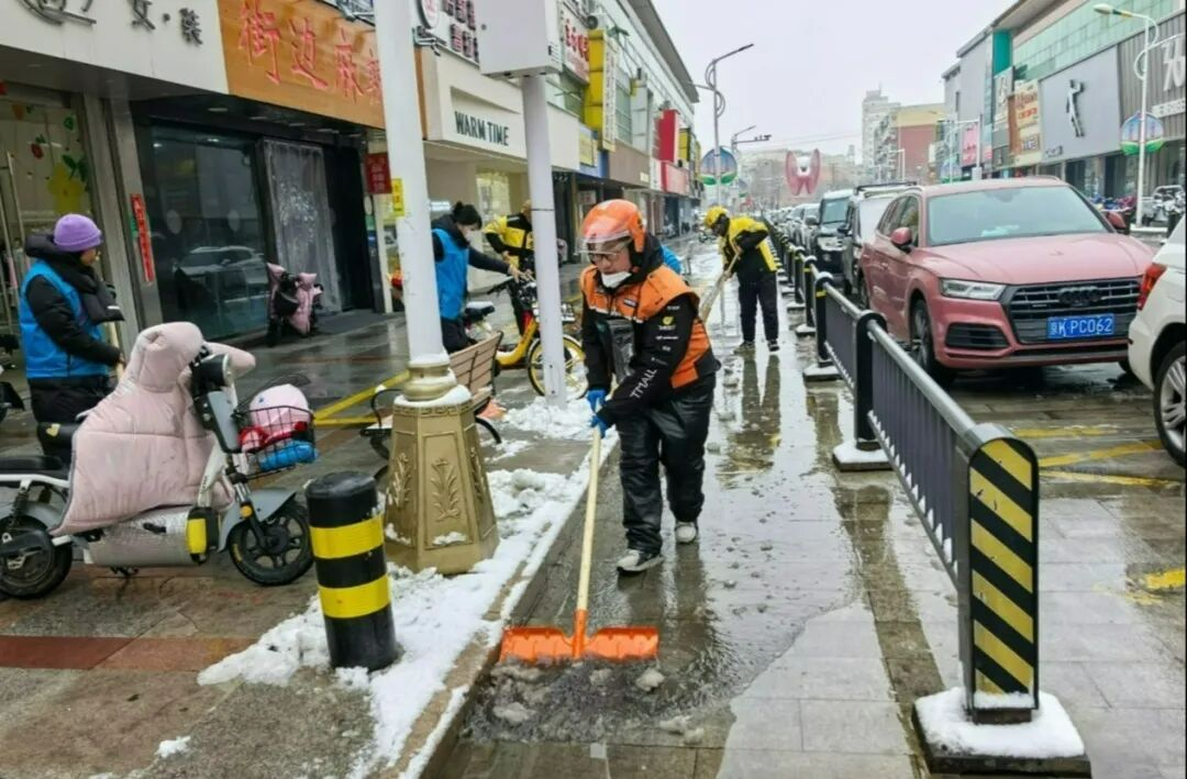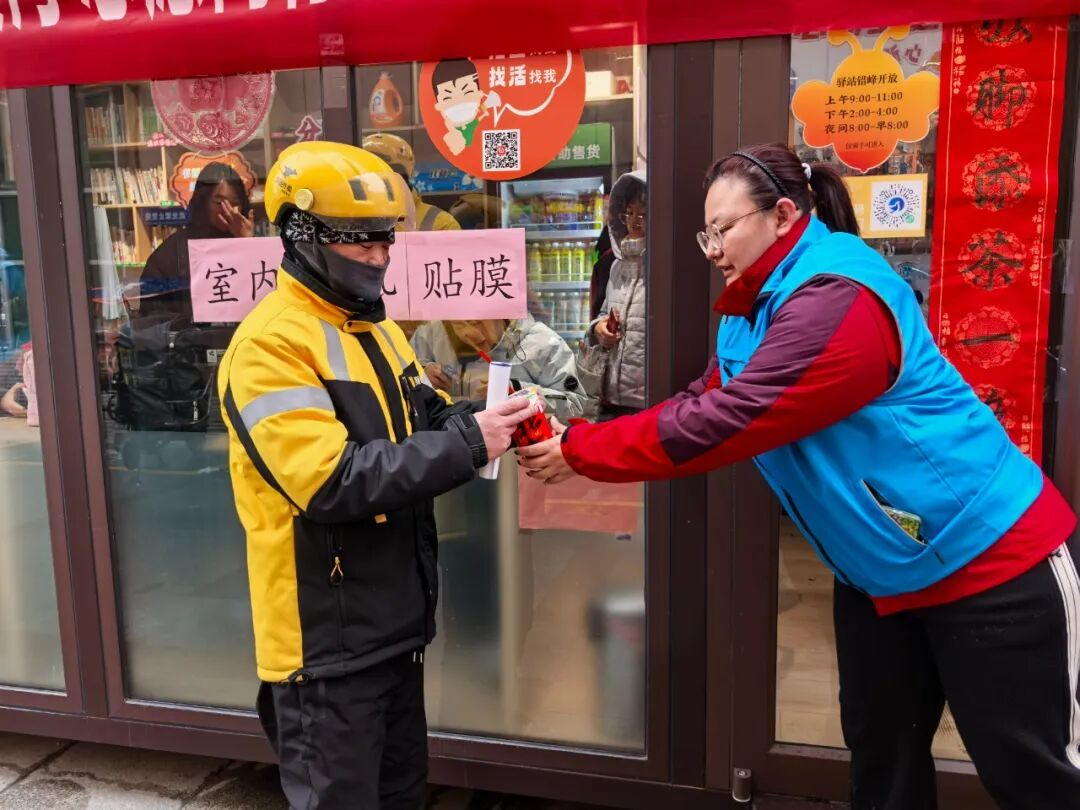 步行街“暖心驿站”内,志愿者们为新就业群体提供贴心服务。中国移动志愿者为外卖小哥免费贴膜,农业银行志愿者进行反诈宣传,擅长修车的志愿者为电动车打气、紧刹车,巾帼志愿者递上热奶茶。一位快递员笑着说:“平时都是我们给别人送货,今天自己也收到了温暖。”小小的驿站,成为外卖员、快递员、网约车司机随时歇脚的“家”。刚刚在驿站歇过脚的外卖小哥们,作为滨河街道“四员先蜂”志愿者,转身就加入了扫雪队伍,贡献着自己的力量。