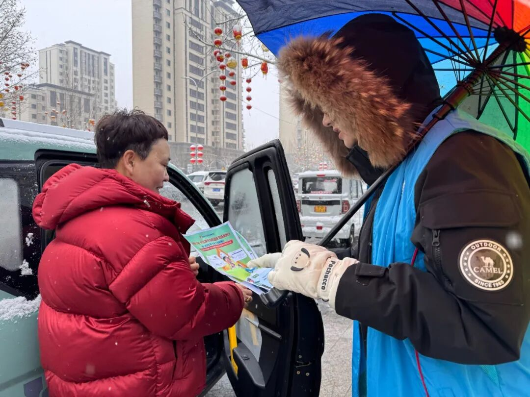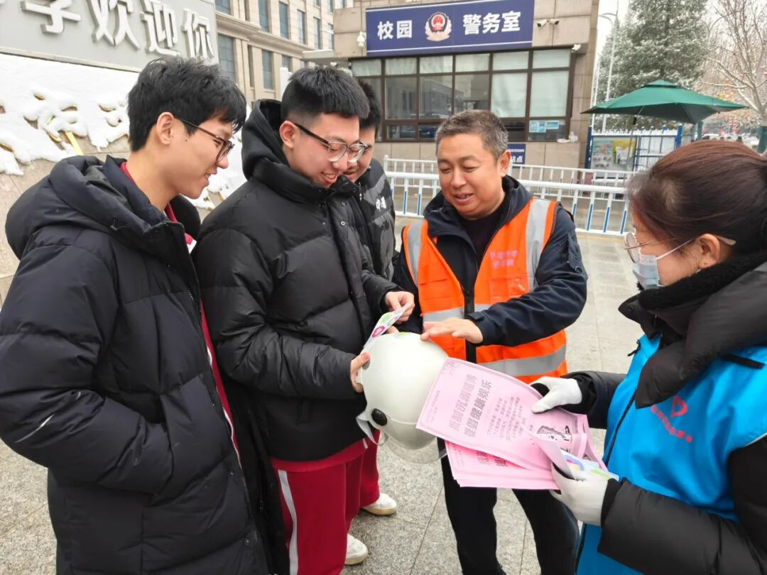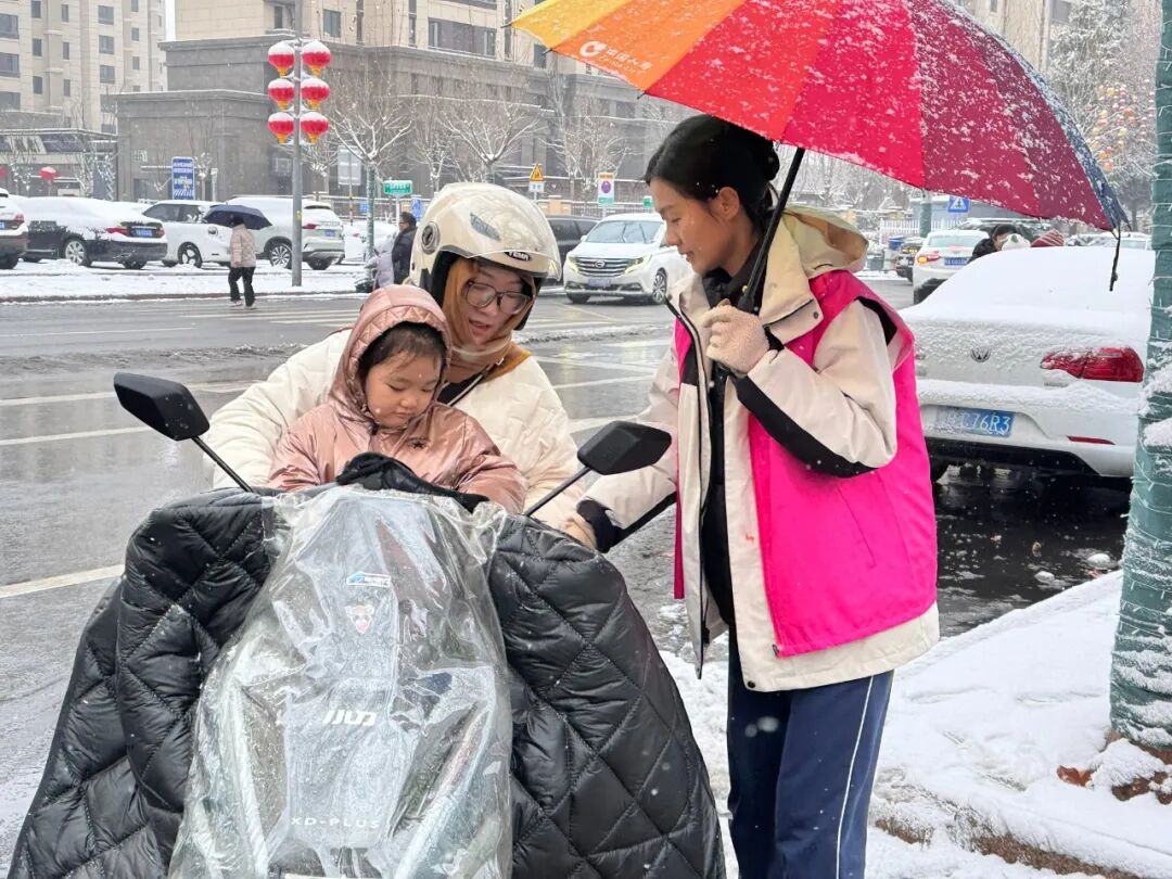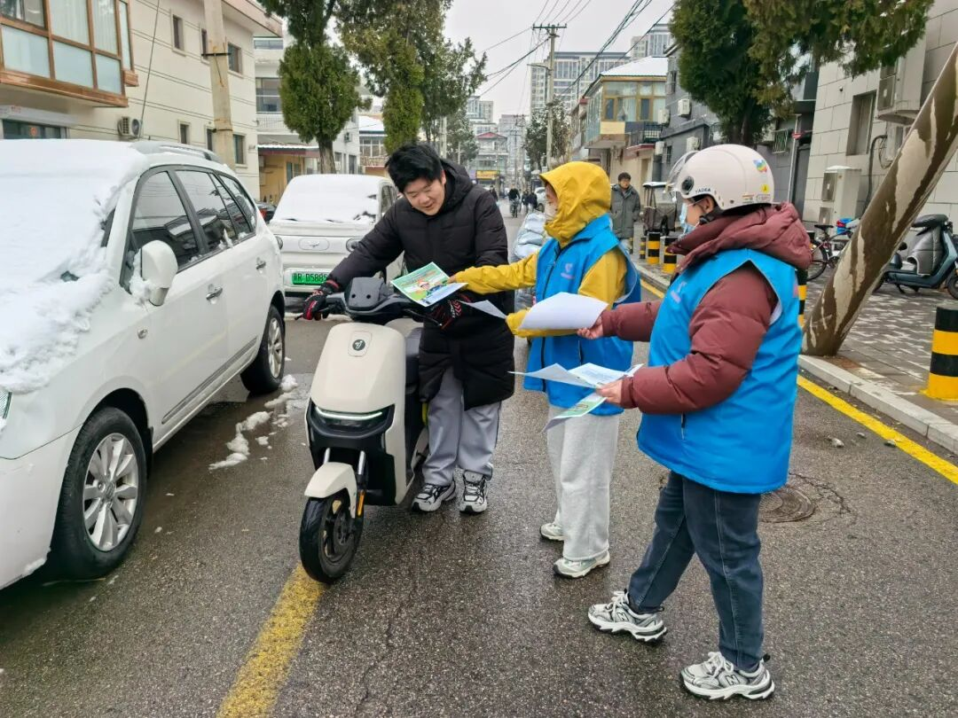 放学时分,辖区各学校门口志愿者们准时上岗。他们拦停过往车辆护送学生过马路,引导家长有序停车,利用等候时间发放“一盔一带”宣传单,为孩子们的自行车、家长的电动车贴上反光贴。雪天路滑,志愿者们忙碌的身影,让家长放心、学生安心。