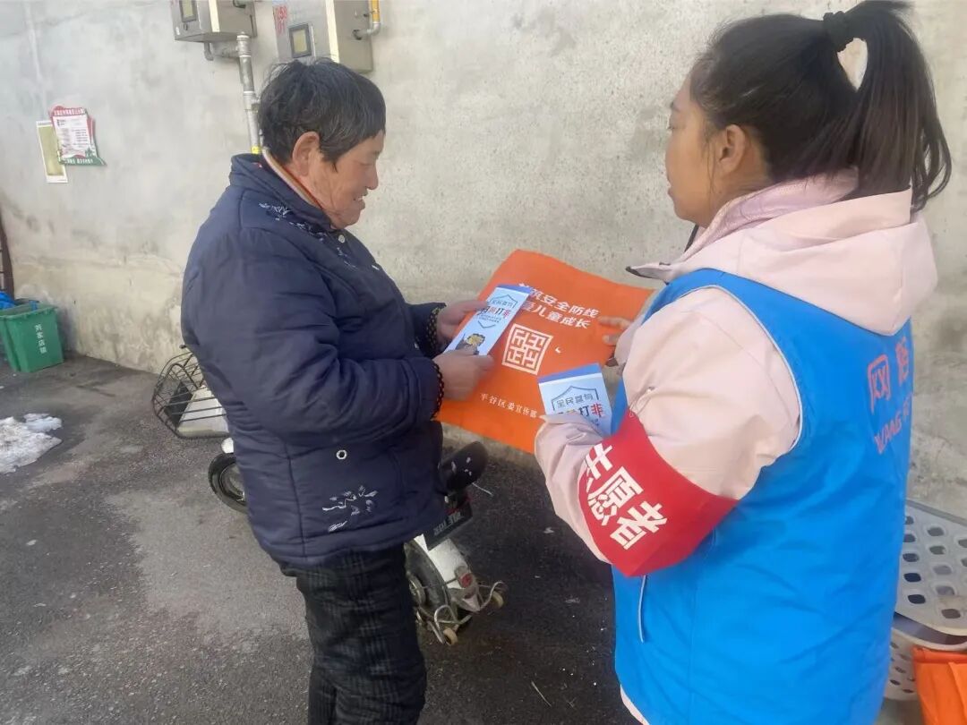 镇宣传科联合万庄子村新时代文明实践站,将“扫黄打非”工作“入格”“入网”。工作人员携手网格员走进群众家中,发放宣传品,结合老年群体特点,将“扫黄打非”相关知识转化为通俗易懂的语言,细致讲解相关政策和非法出版物识别方法,提醒老年群众提高防范意识,自觉抵制各类有害信息,守护自身合法权益。