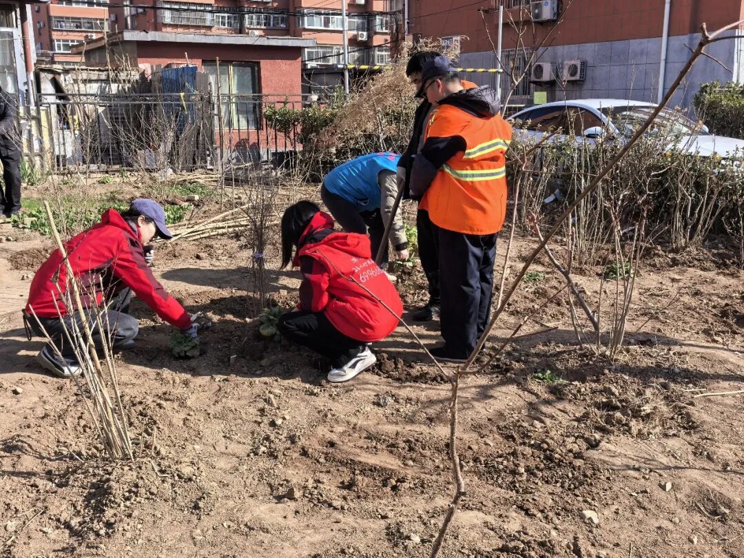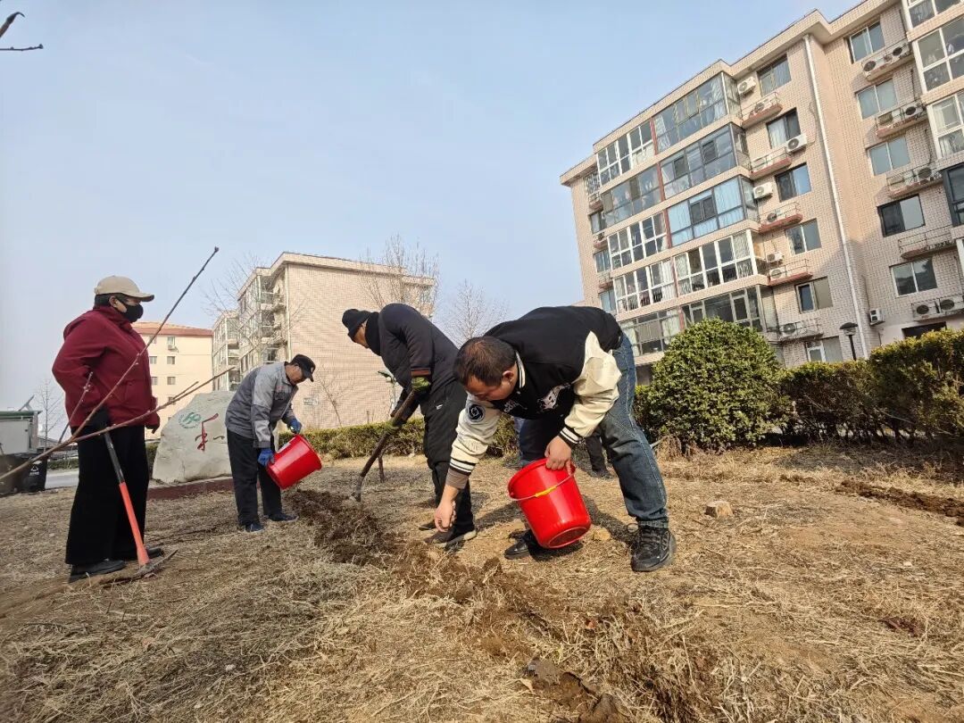 栽种一株苗:亲手植下玉兰树,共赴春日之约。志愿者分工协作栽种玉兰树,党员带头参与,社区工作人员统筹把控,同时为月季花松土,改善土壤环境,为社区增添新绿。