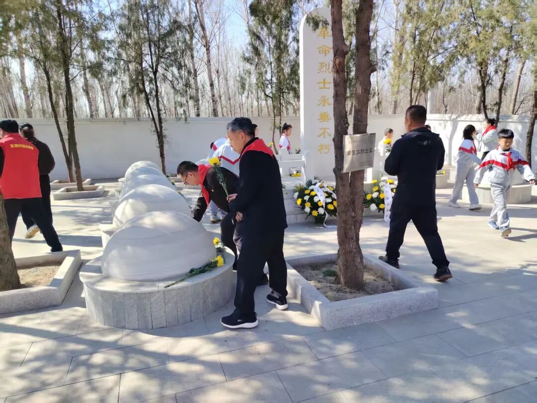 参加活动人员整齐肃立于南张岱烈士墓前,以庄重仪式缅怀革命先烈,汲取前行力量。全体人员低头默哀,追思革命先烈的不朽功勋。东高村镇党员代表、团委代表及老师和少先队员代表依次向烈士敬献花篮,致以崇高敬意与深切缅怀。
